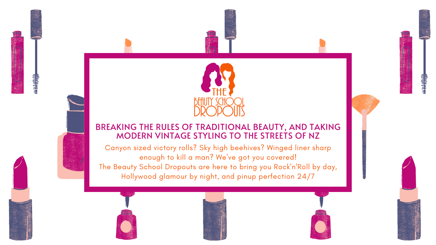 The Beauty School Dropouts have everything you need to make your vintage and pinup hair and makeup dreams a reality! As well as selling all our favourite products and accessories, we take hair and makeup bookings all over the country for parties, weddings, photoshoots, and events, along with teaching group workshops and private lessons.