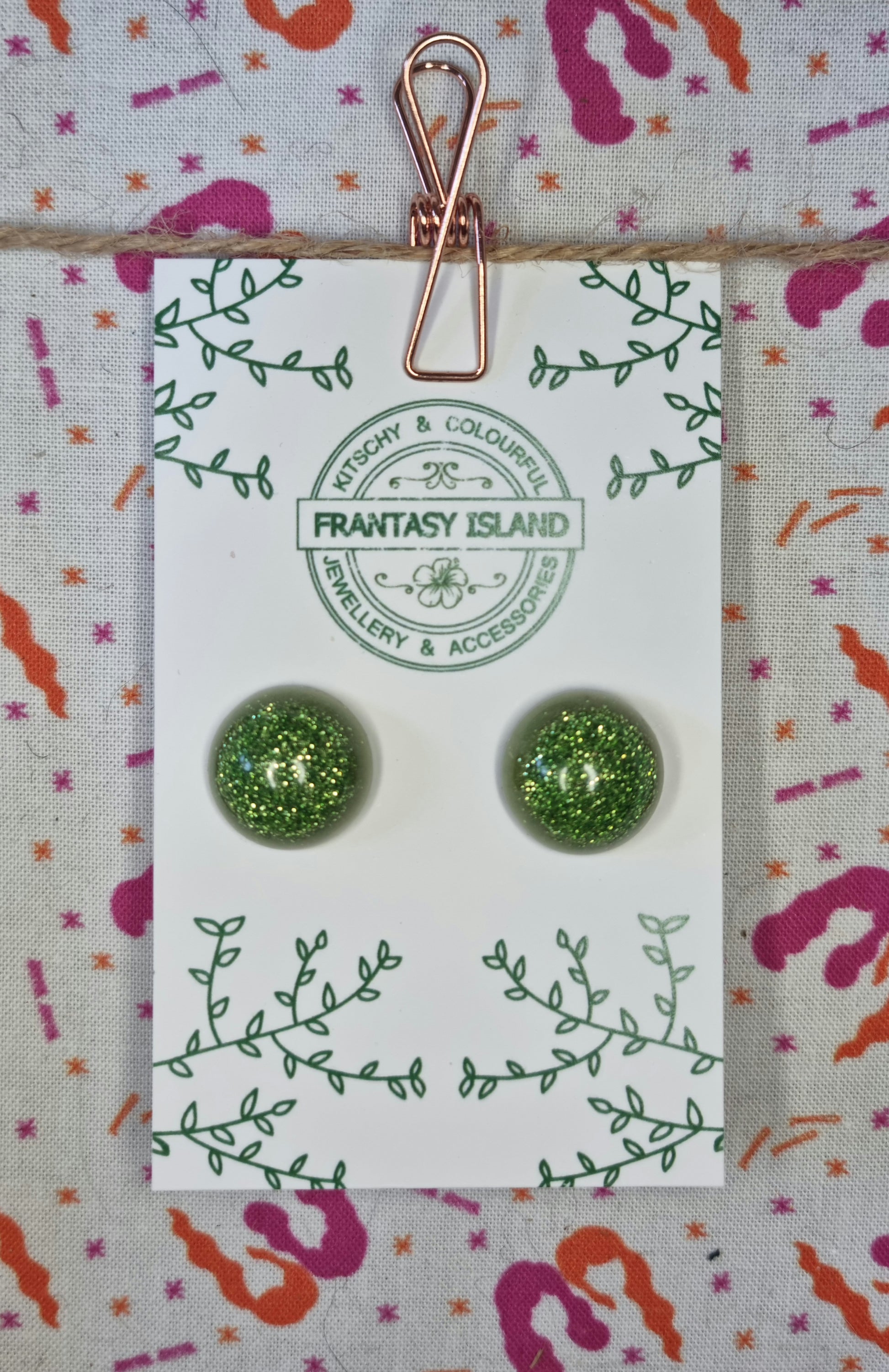 These fresh apple green glitter stud earrings have a blend of bright green glitters and holographic glitters set in shimmery green resin - Perfect for any occasion.