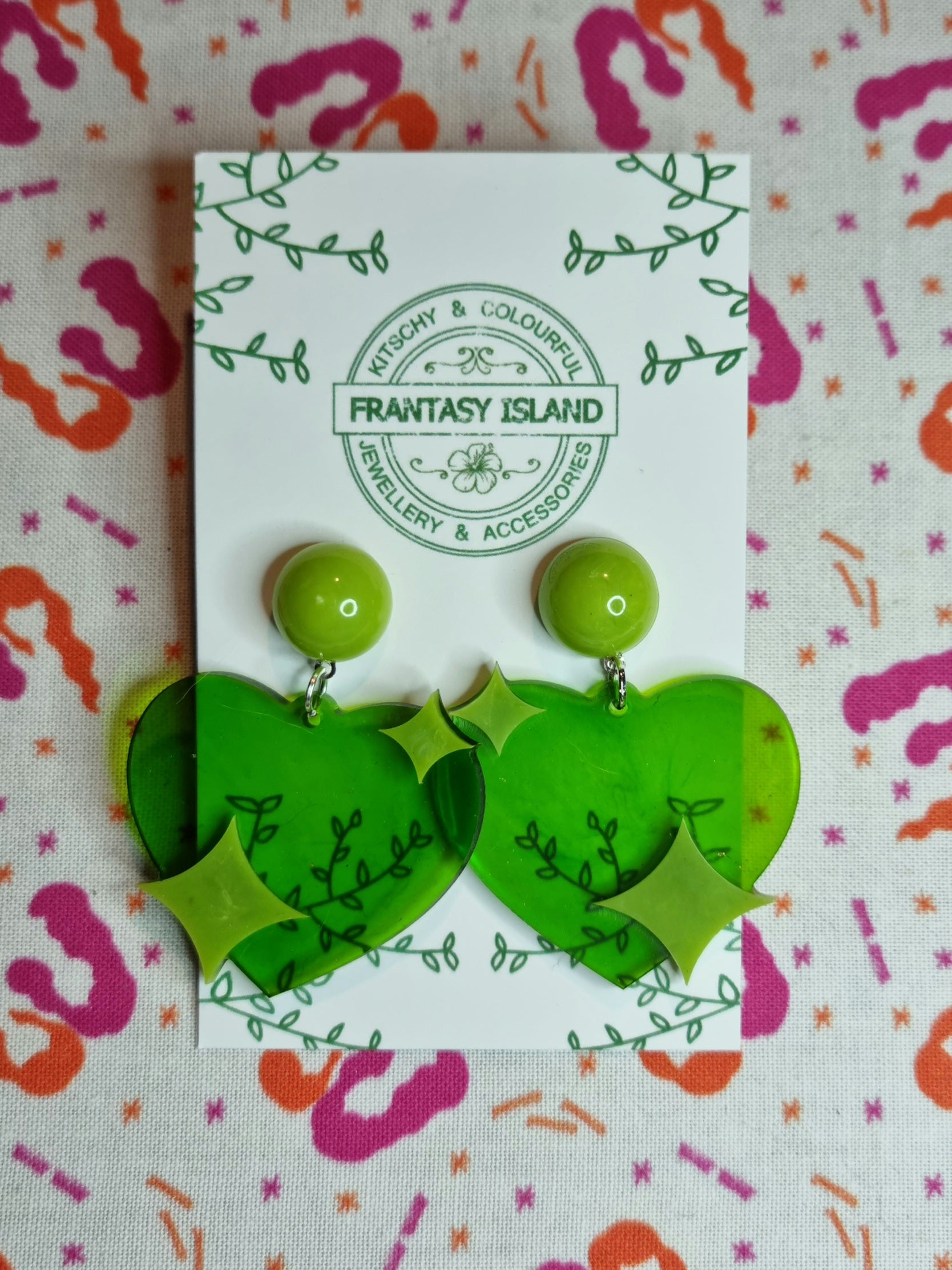 Now, we know we're good at glamorous sparkly things, but we're also really good at quirky nonsense, and these translucent green heart earrings with opaque apple green glossy details are exactly that - quirky nonsense, perfect for any occasion