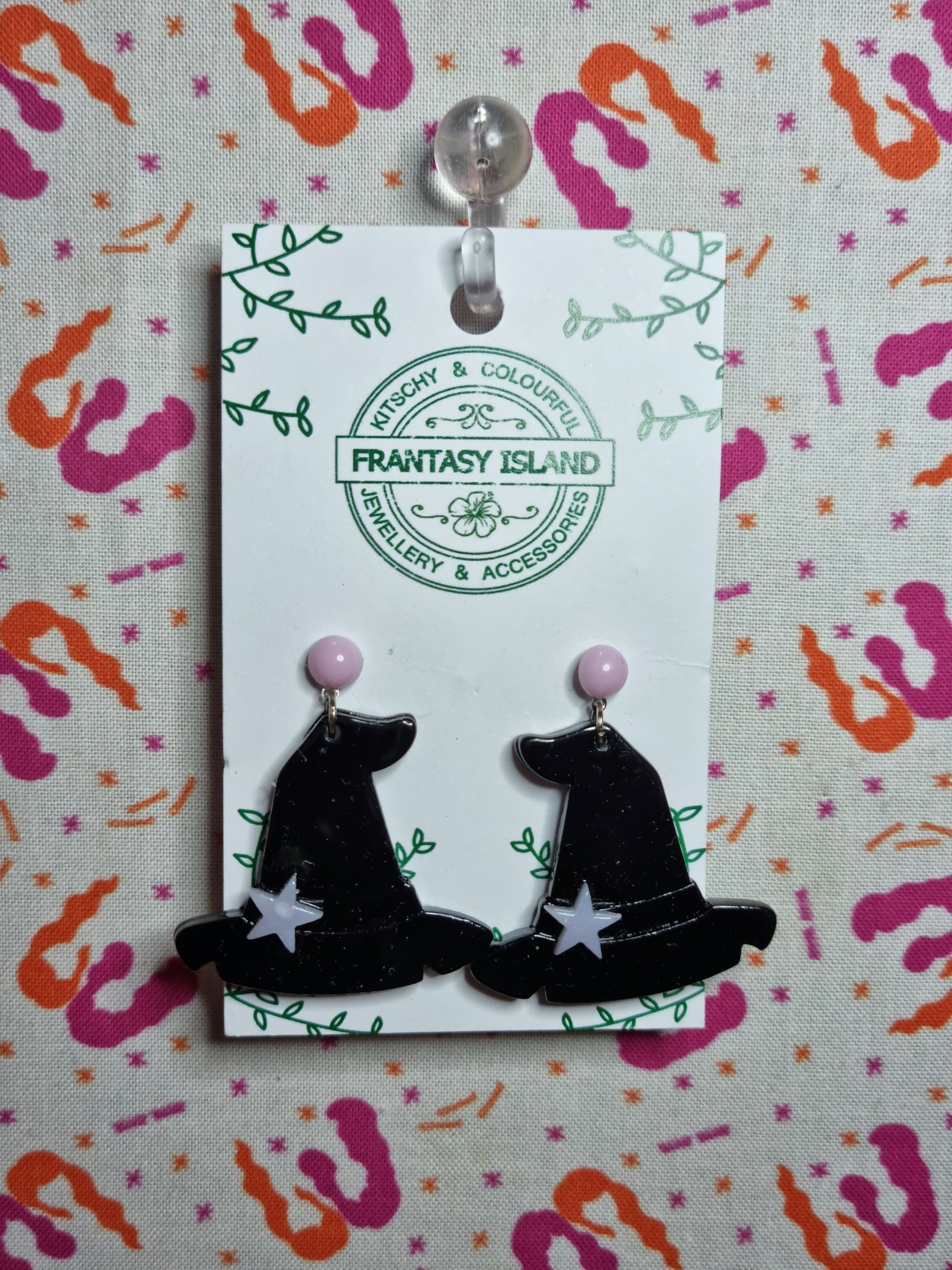 Put a sparkle in your hex-factor with these witchy Witch Hat Earrings! Featuring a glossy black hat with silver star detail, these earrings are perfect for adding some mischievous magic to any outfit.