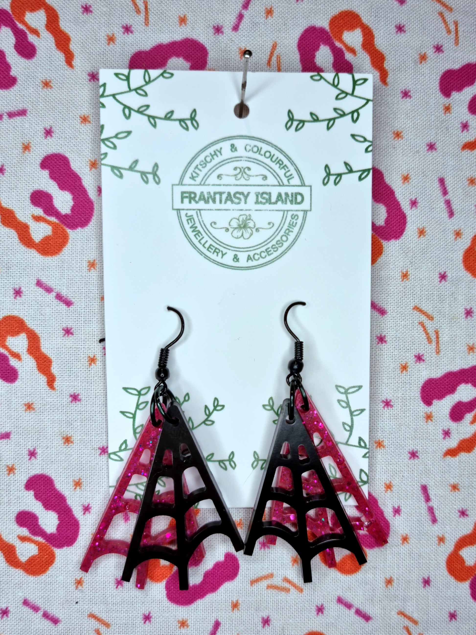 These glossy black and fuchsia glitter spiderweb earrings are spooky and spectacular - Perfect for any occasion.