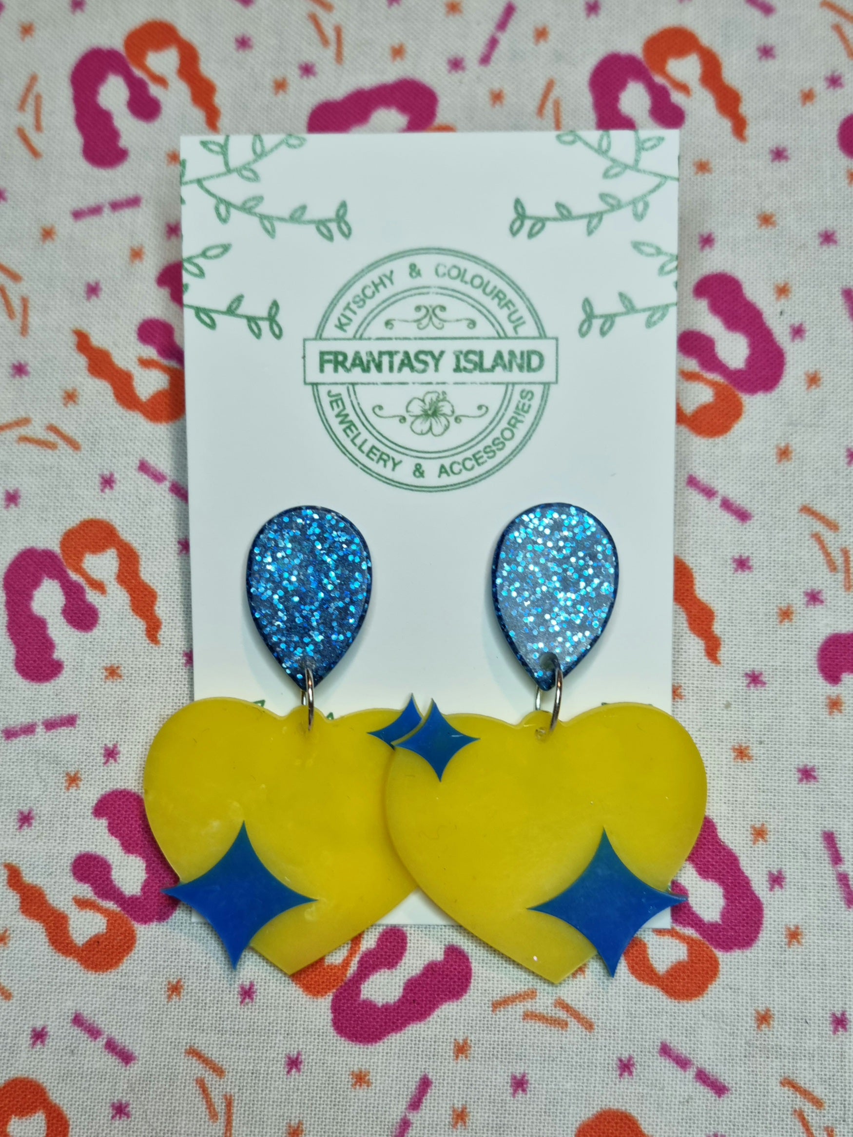 Now, we know we're good at glamorous sparkly things, but we're also really good at quirky sparkly nonsense, and these yellow and blue heart earrings are exactly that - Sparkly nonsense, perfect for any occasion