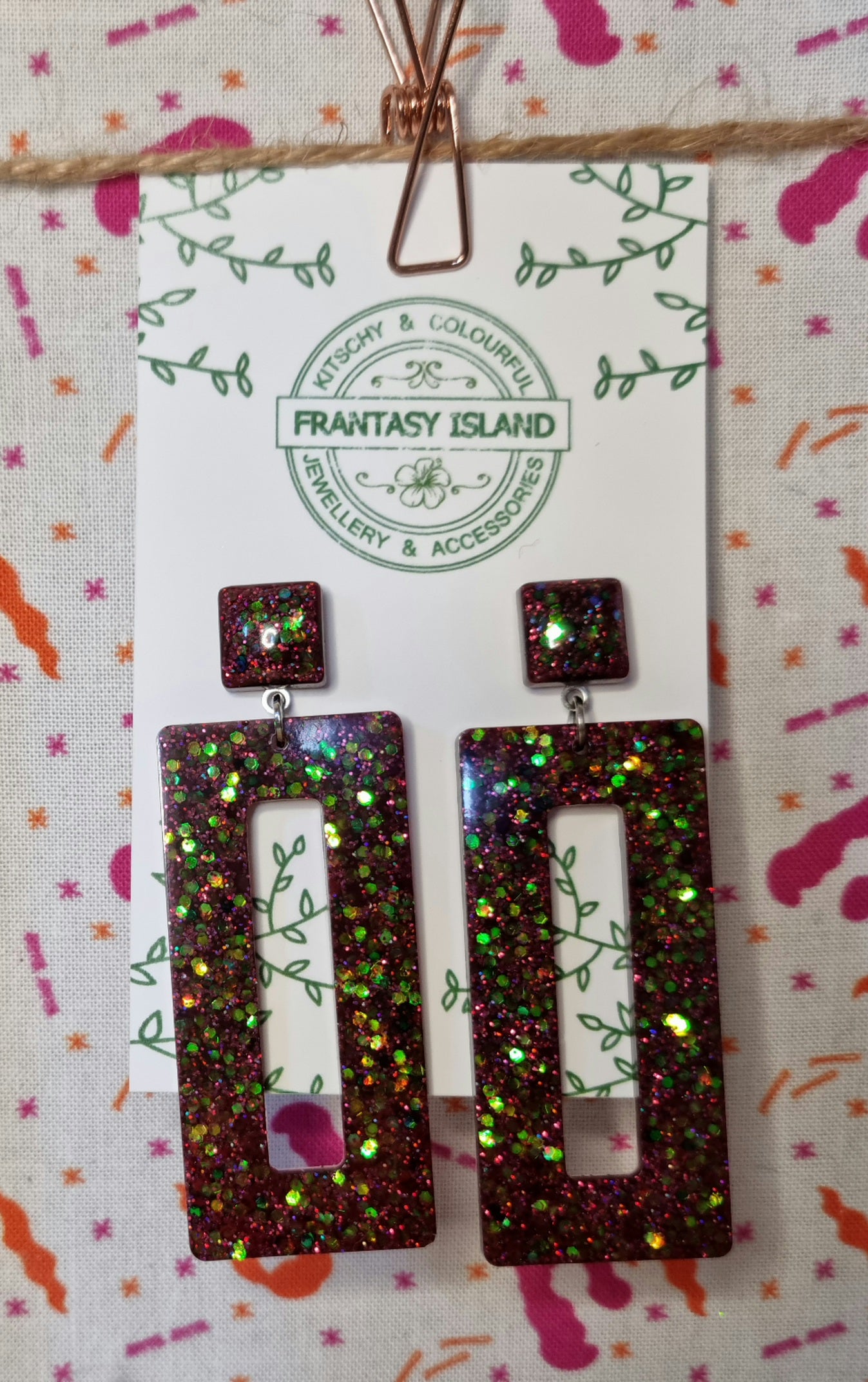 These brown glitter teardrop earrings have an exaggerated retro shape, with deep burgundy, brown, and colour shifting iridescent glitter set in a warm brown metallic resin - Perfect for any occasion.