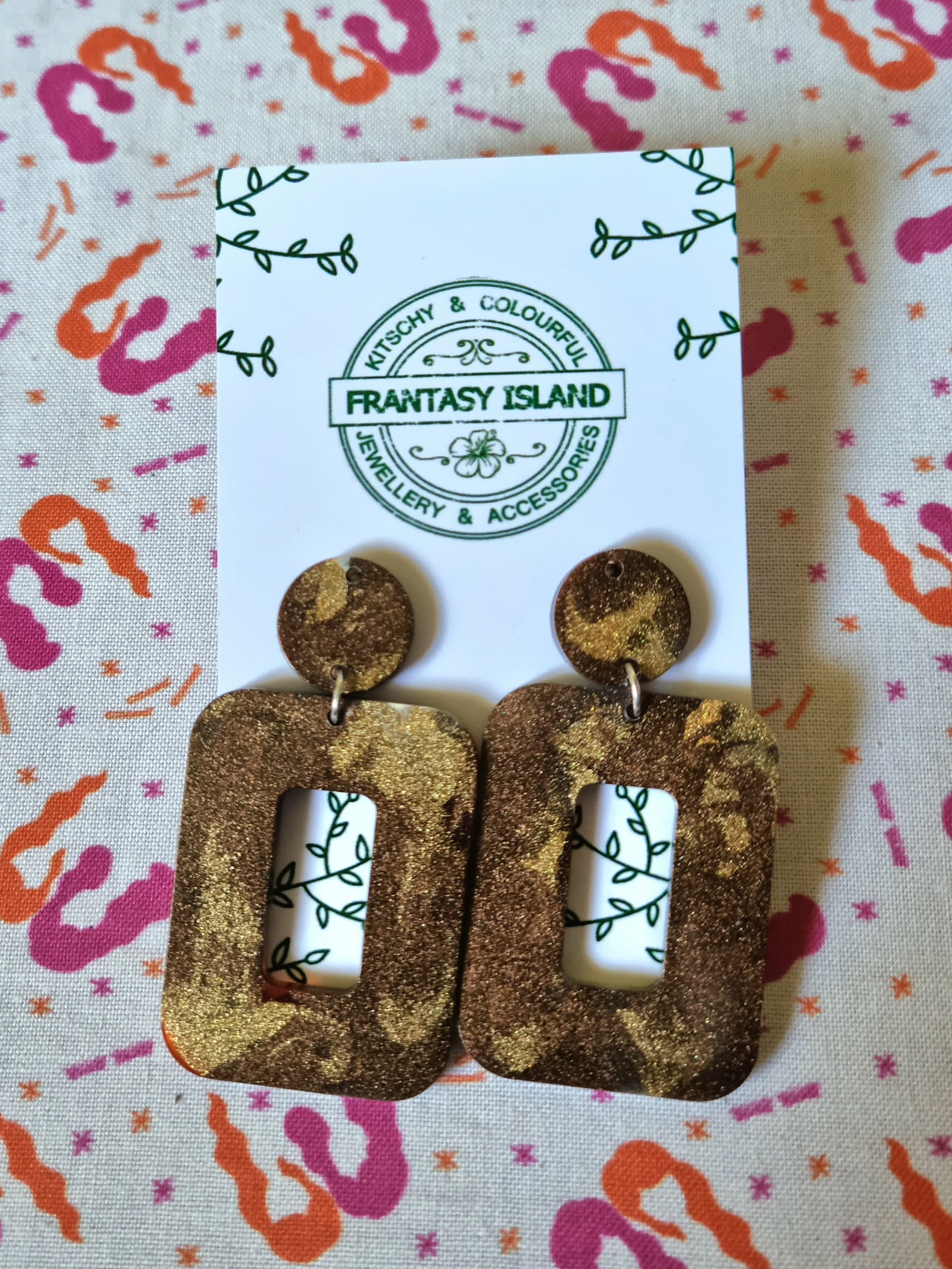 These brown and gold teardrop earrings have an exaggerated retro shape, with bright sparkly gold pigment swirled through a warm brown metallic resin - Perfect for any occasion.