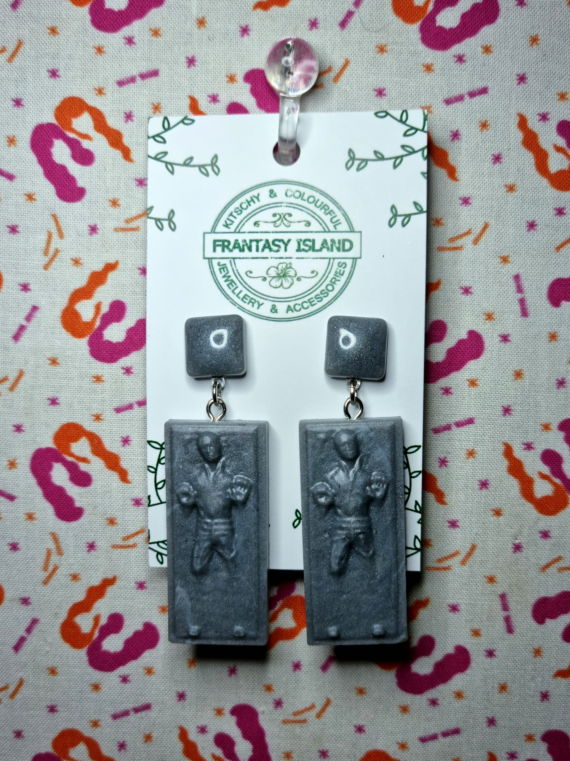 Crafted with resin and modeled after the iconic image of Han Solo frozen in carbonite, these earrings add a dose of intergalactic glamour to your style - no Millenium Falcon required.