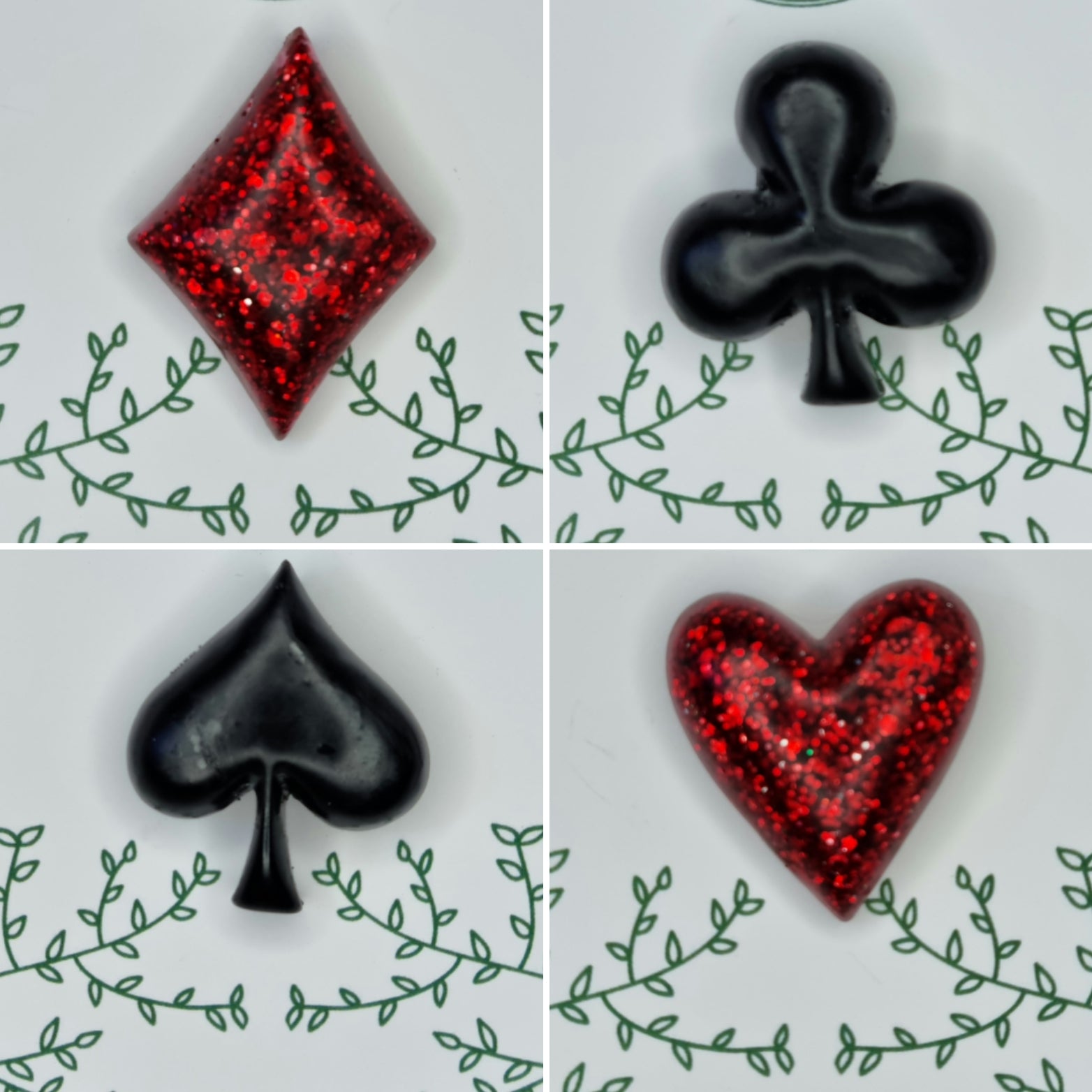 3D card suit heart, diamond, spade, and club pins in red glitter and black gloss resins.