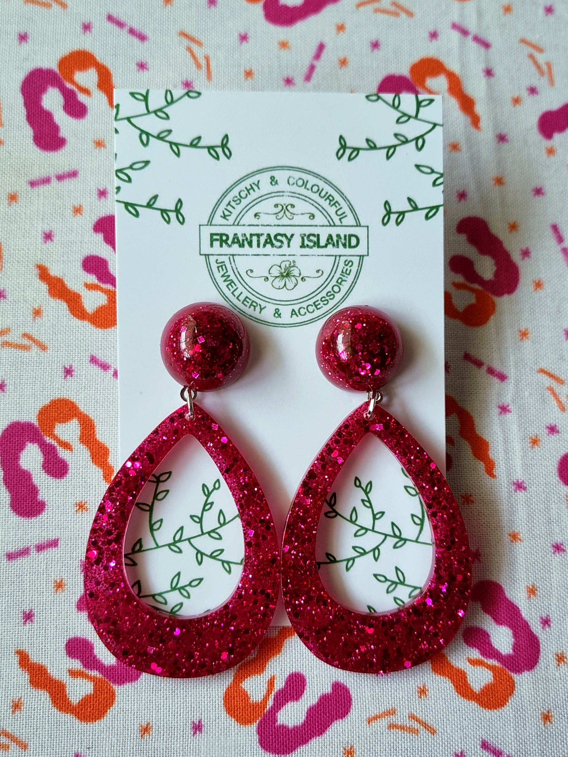 These vivid cerise glitter teardrop earrings have a classic retro shape, with a blend of pink glitters set in deep pink resin - Perfect for any occasion.