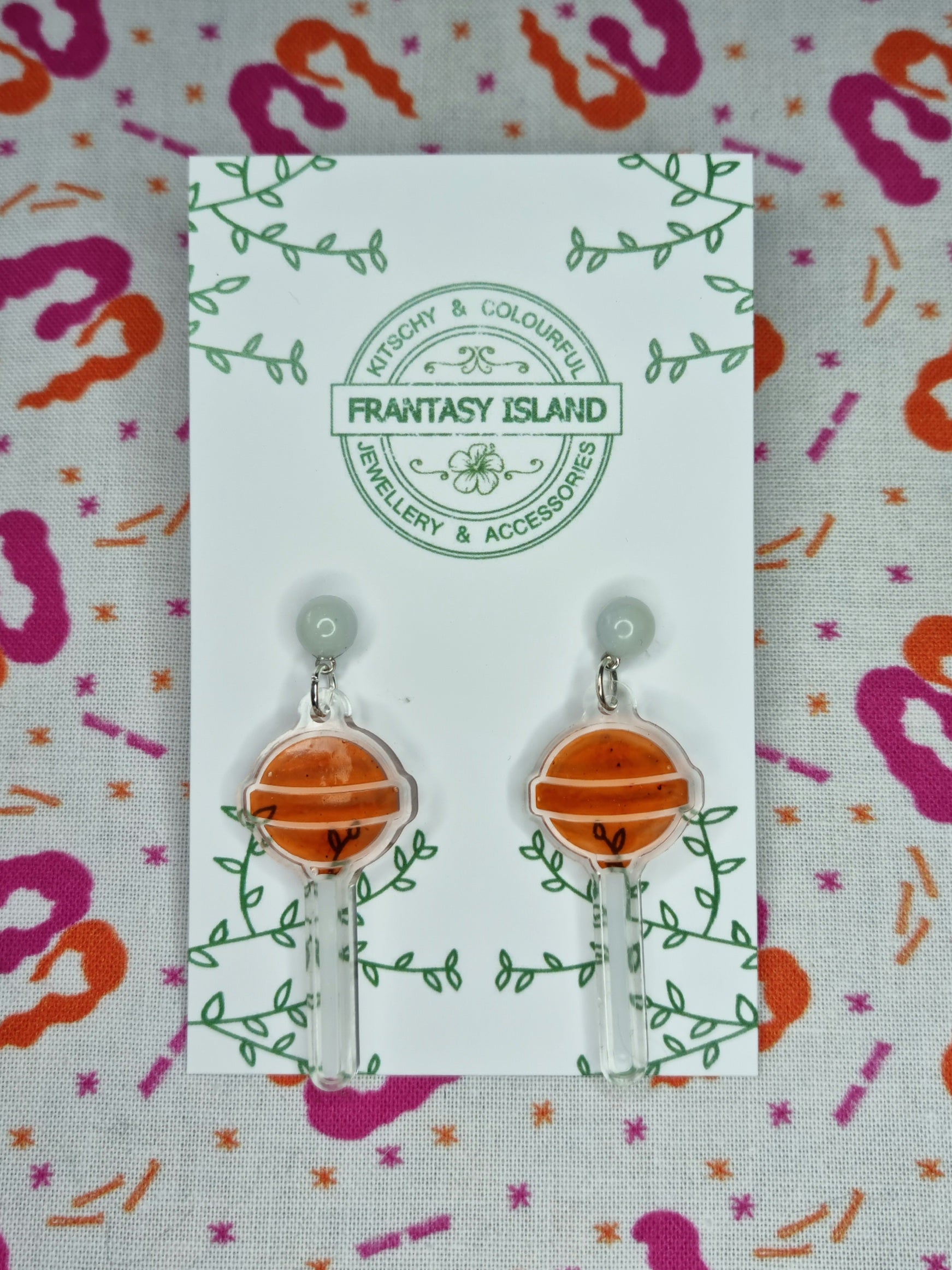 These earrings have a cola brown and white lollipop set in clear resin - Perfect for any occasion.