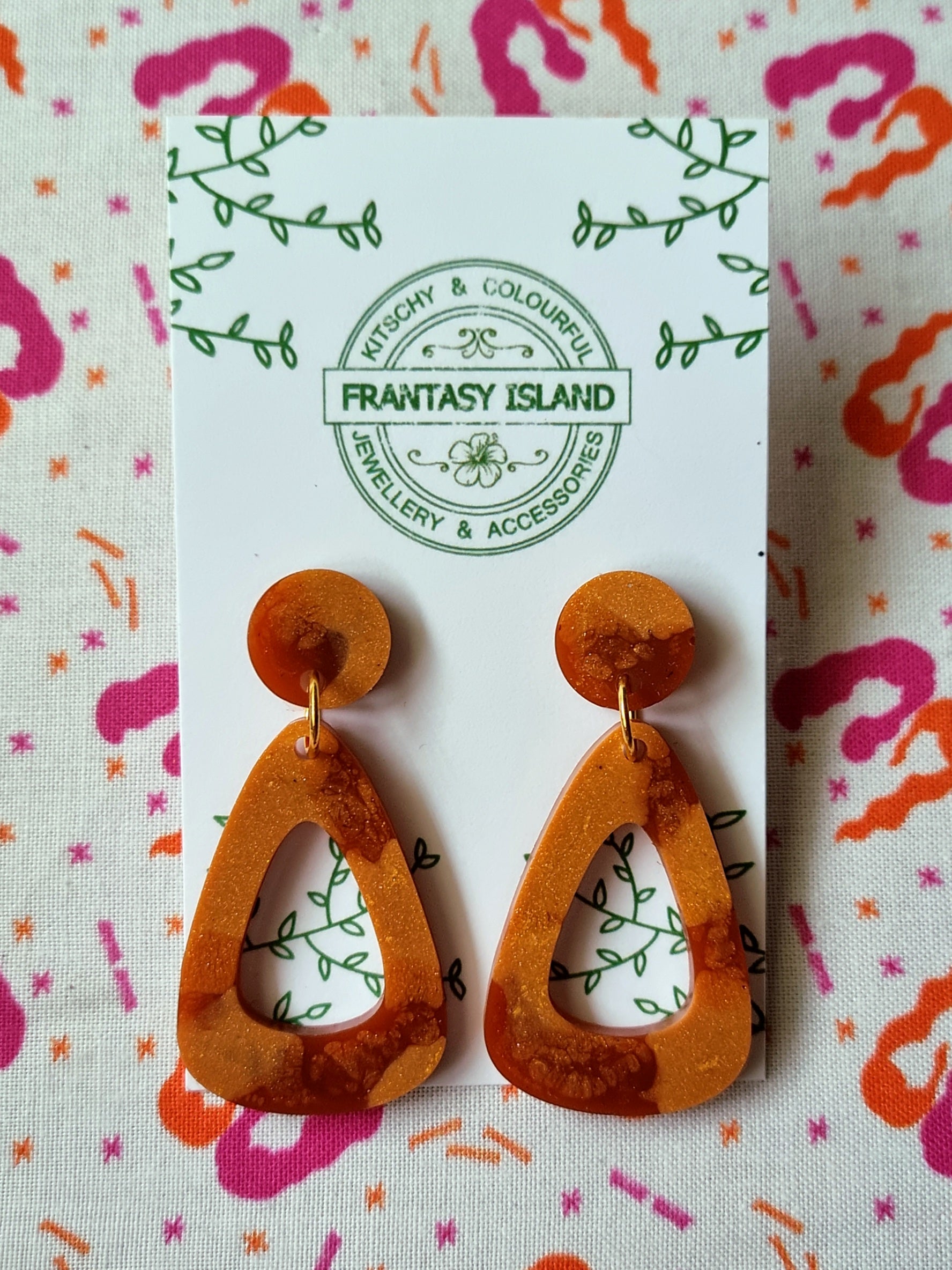 These multicoloured tortoiseshell teardrop earrings have a classic retro shape, with swirls of brown, gold, and copper shimmery resin - Perfect for any occasion.