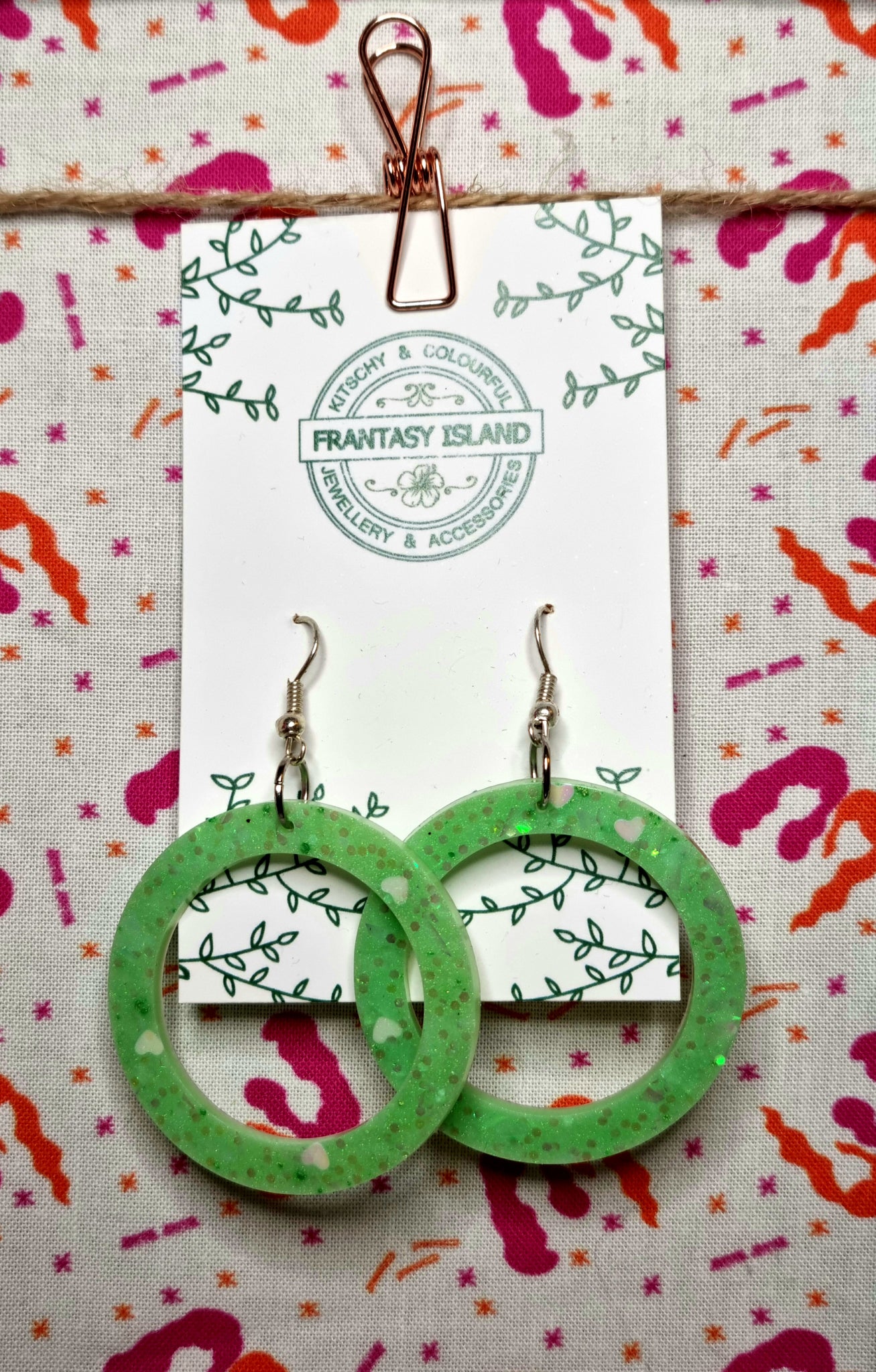 These bright green hoop earrings have an exaggerated retro shape, with holographic glitter and heart shaped sequins set in a soft green resin - Perfect for any occasion.