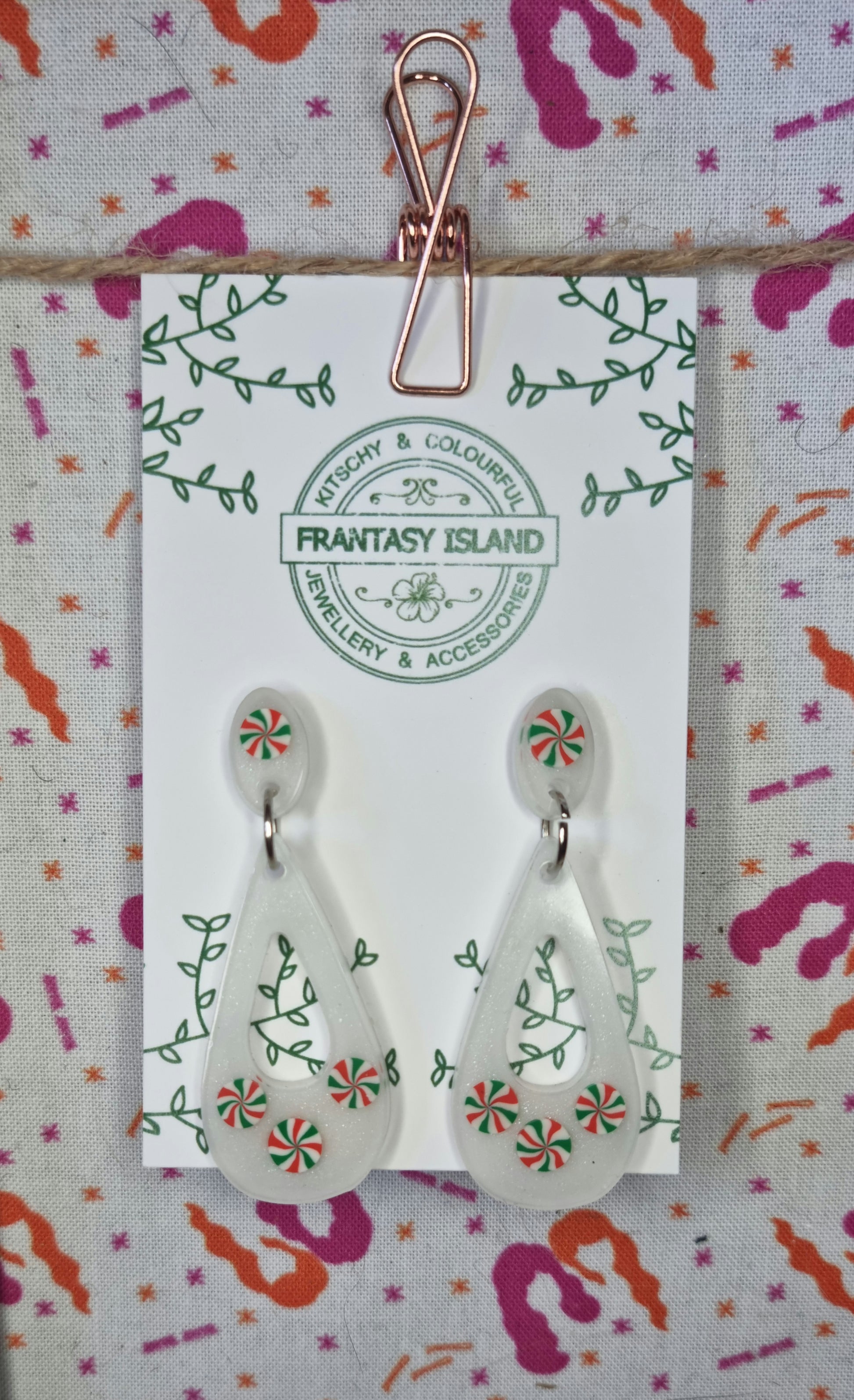 These teardrop earrings have a subtle retro shape, with peppermint candy set in shimmery white resin - Perfect for any occasion.