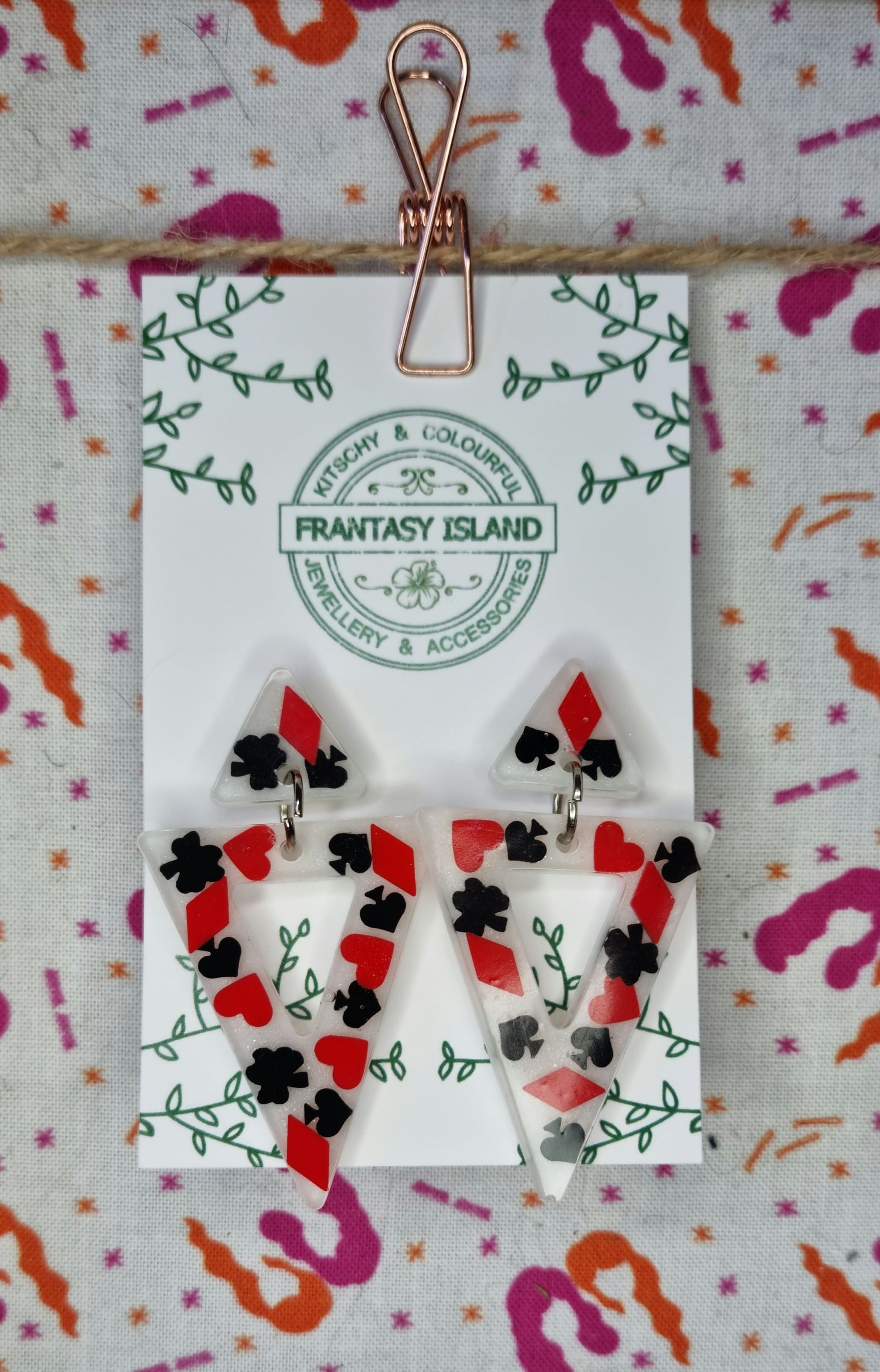 These pyramid drop earrings have a subtle retro shape, with hearts, diamonds, spades, and clubs set in white resin - Perfect for any occasion.