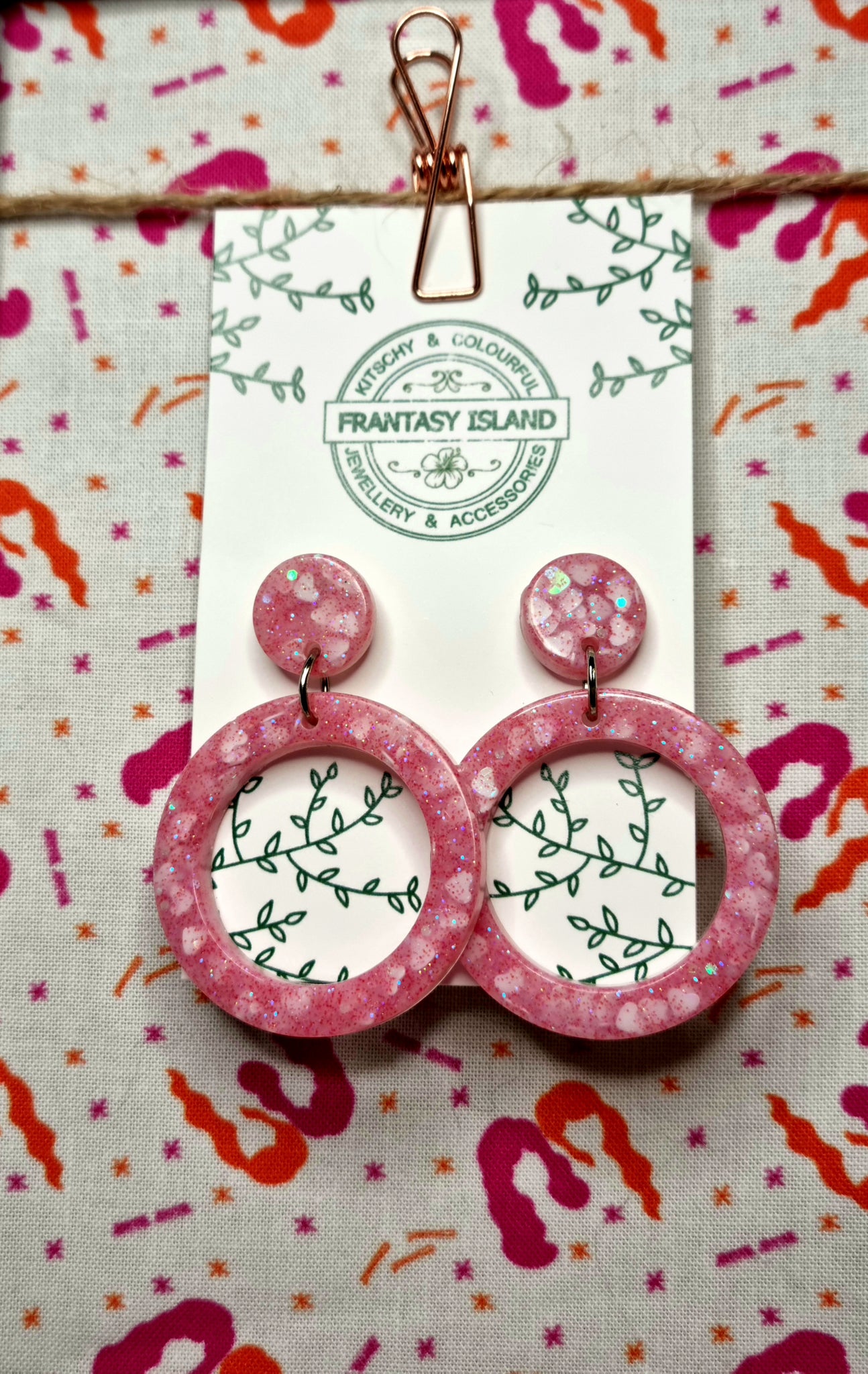 These candy pink glitter hoop earrings have a classic retro shape, with a blend of pink glitters and cute heart shaped sequins set in pink resin - Perfect for any occasion.