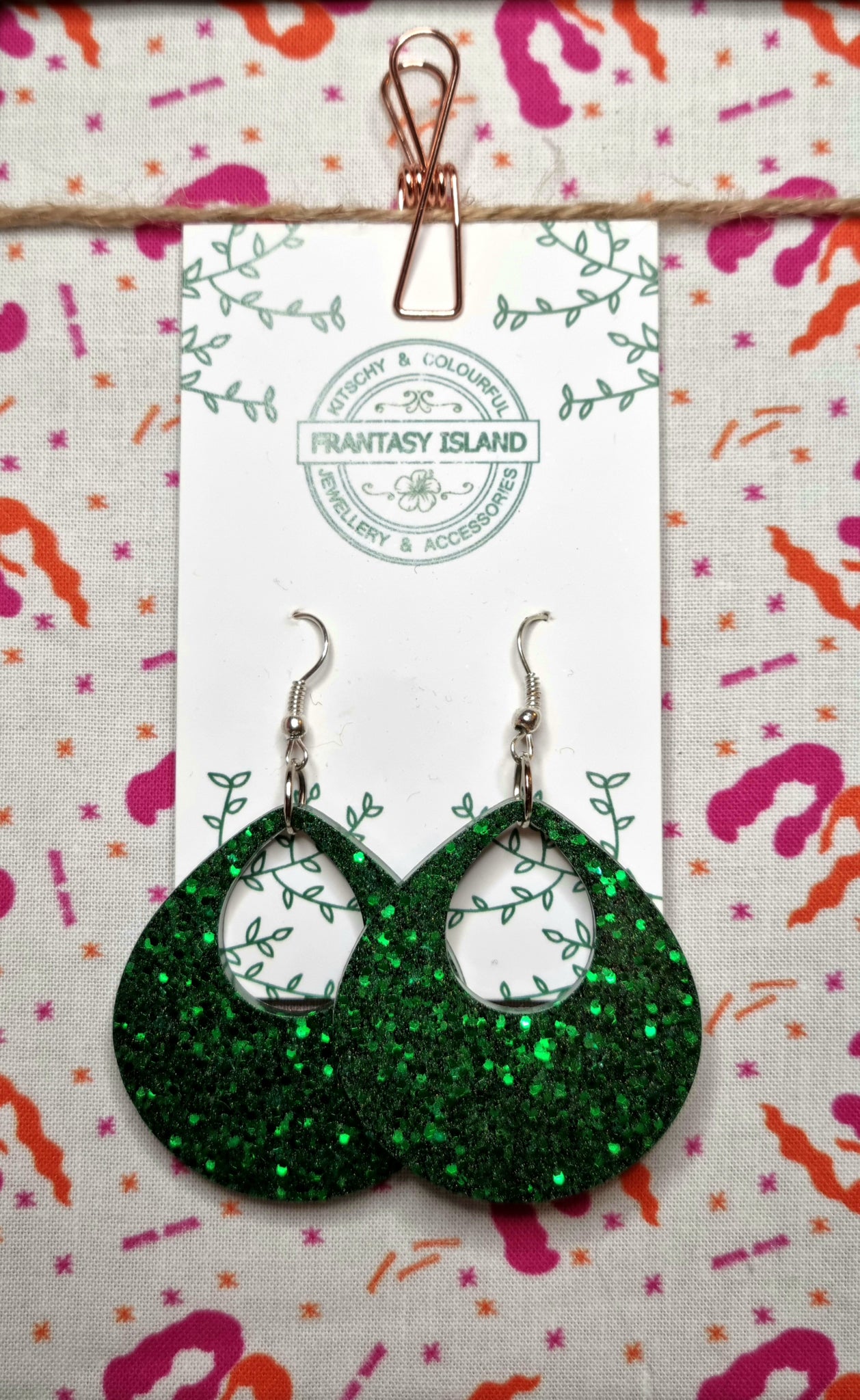 These emerald green teardrops are about as glitzy as they come, with an exaggerated retro shape and a mix of rich deep emerald glitters - Perfect for any occasion.