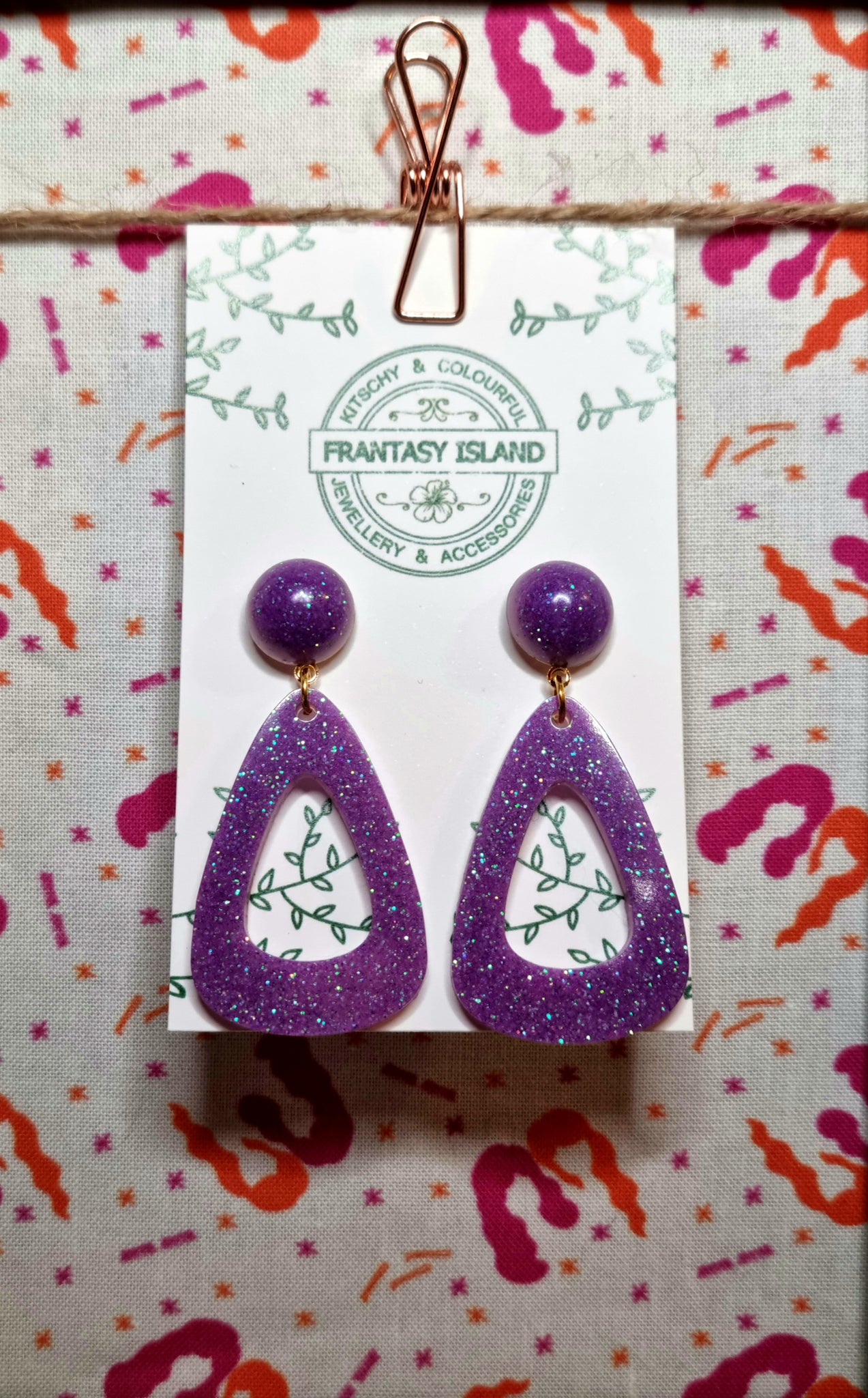 These bright and fun lilac glitter teardrop earrings have an exaggerated retro shape, with holographic glitter set in purple resin - Perfect for any occasion.