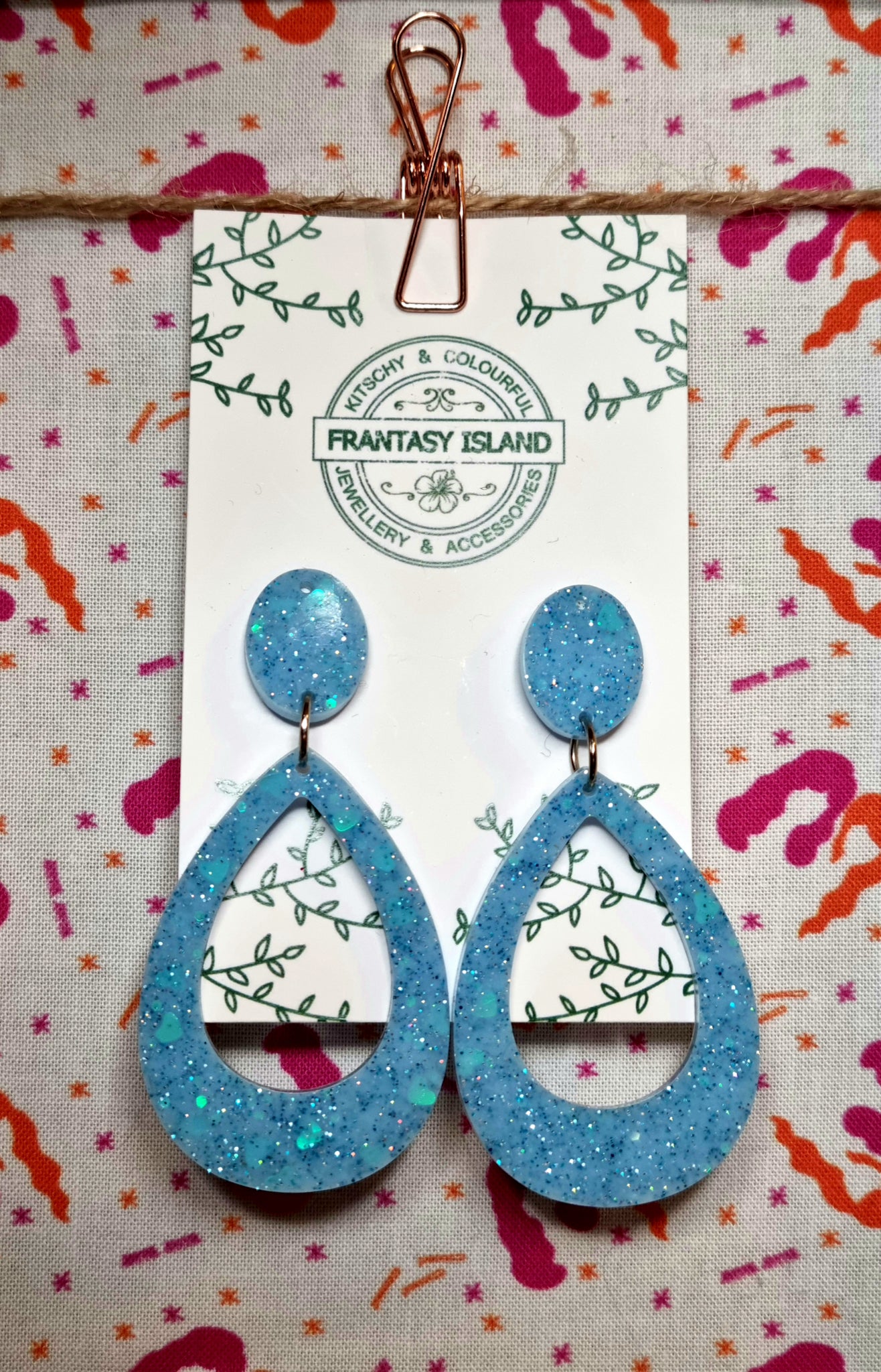 These spectacular pale blue teardrop earrings have a bright wintery feel, with an exaggerated retro shape and mixed blue and silver glitters set in pale blue resin - Perfect for any occasion.