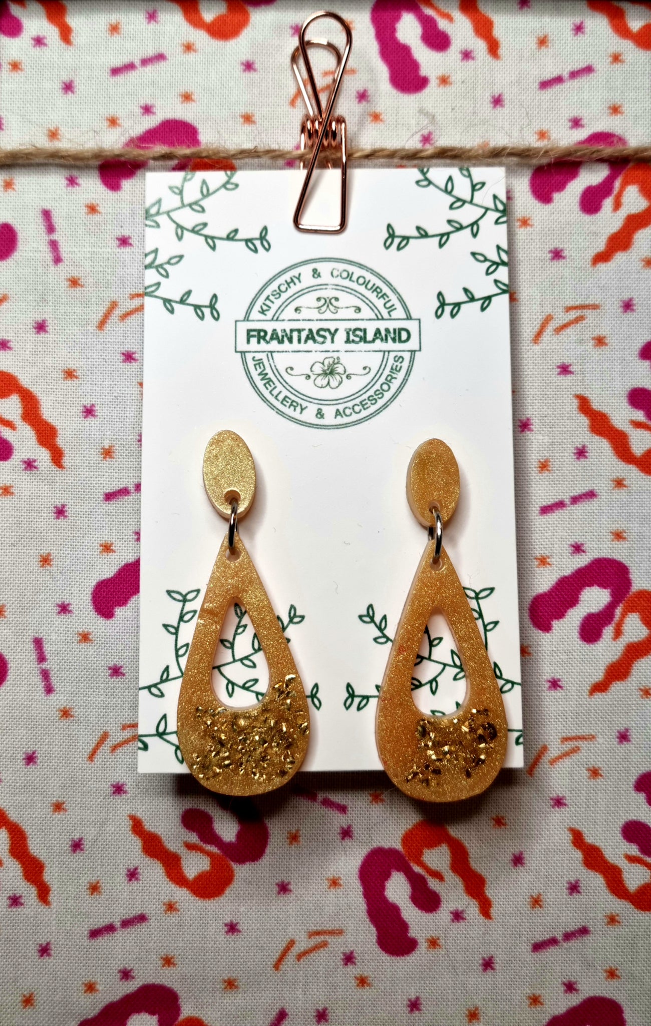 These spectacular soft gold narrow teardrop earrings are about as glitzy as they come, with a classic retro shape and a blend of gold gravel and glitters set in a soft metallic gold resin - Perfect for any occasion.