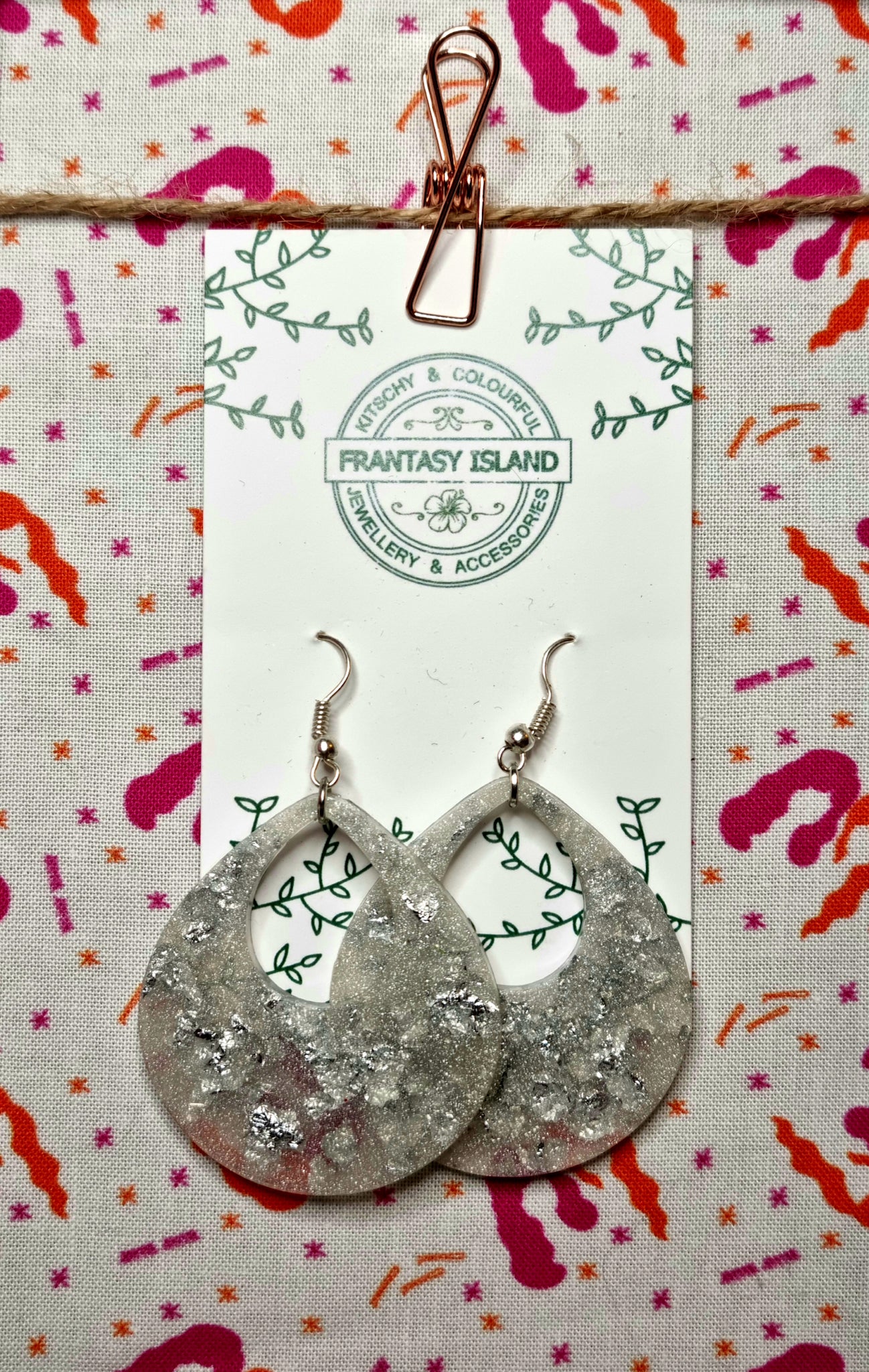These spectacular soft silver teardrop earrings are about as glitzy as they come, with a classic retro shape and a blend of silver leaf and white shimmering pigments set in clear resin - Perfect for any occasion.