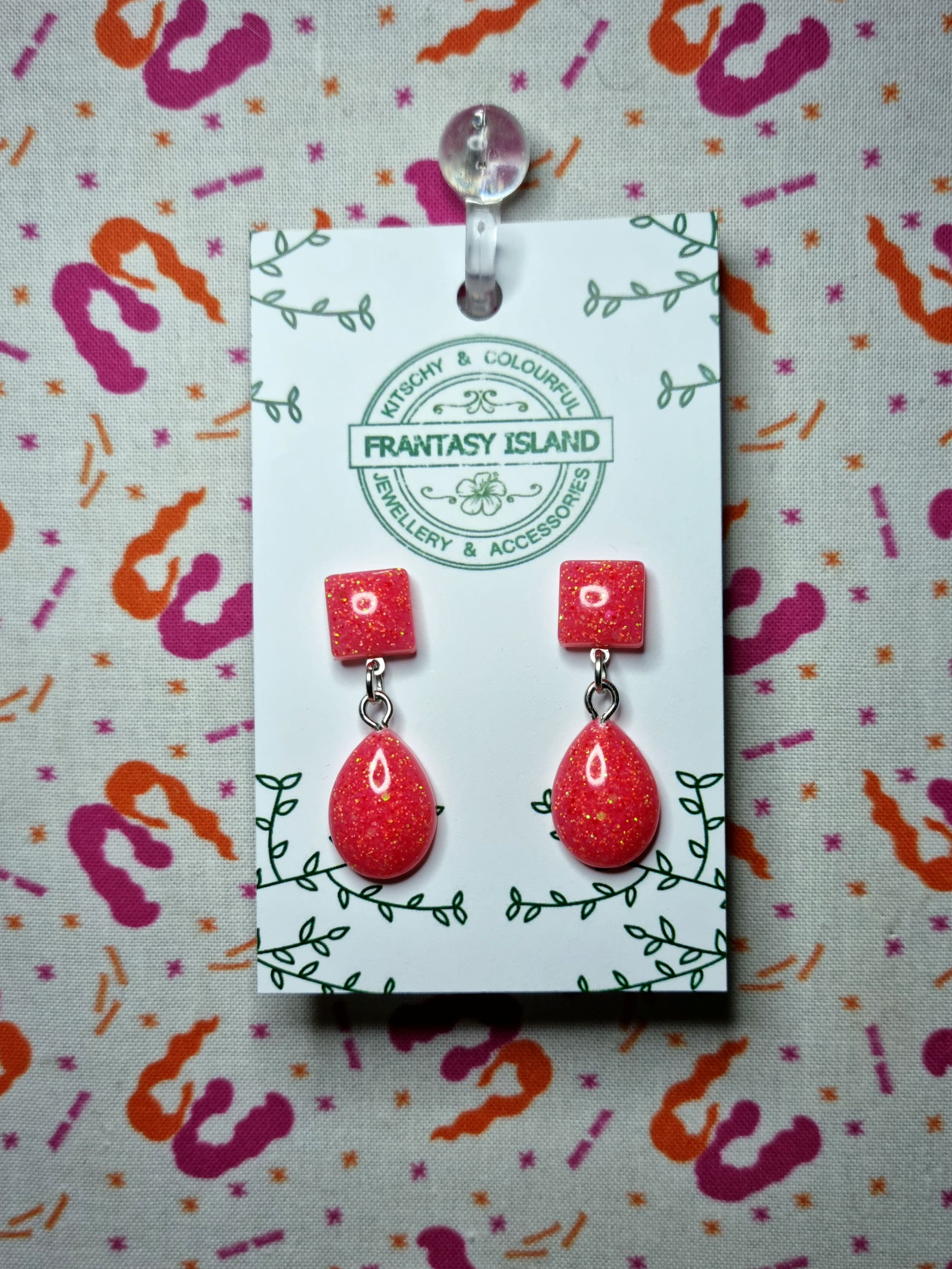 These bright and bold coral glitter teardrop earrings have a classic retro shape, with a blend of all kinds of glitters and sequins set in a punchy pink resin - Perfect for any occasion.