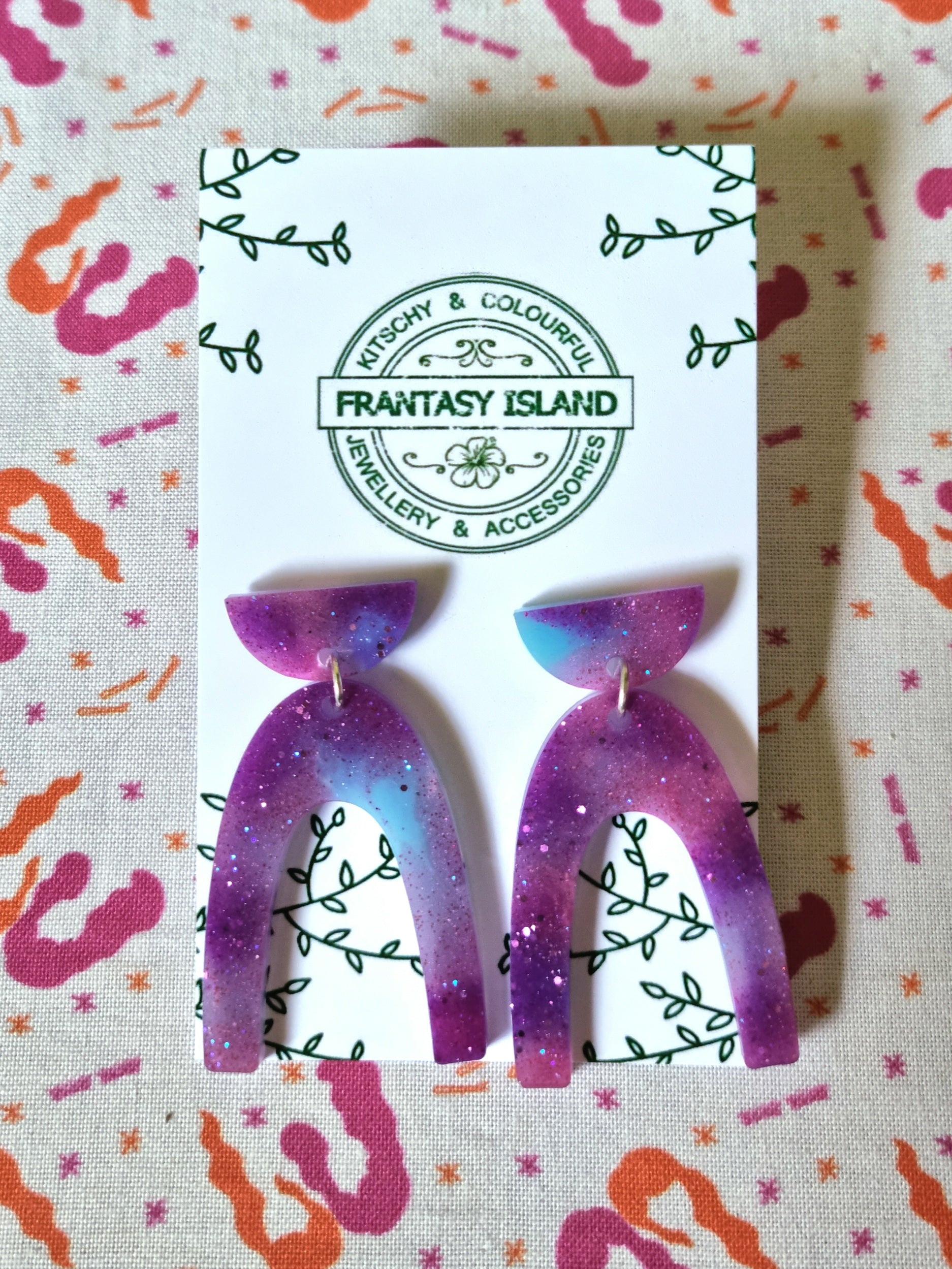 These cosmic glitter arch earrings have an exaggerated retro shape, with lilac, blue, pink, and silver glitter set in marbled purple resin - Perfect for any occasion.