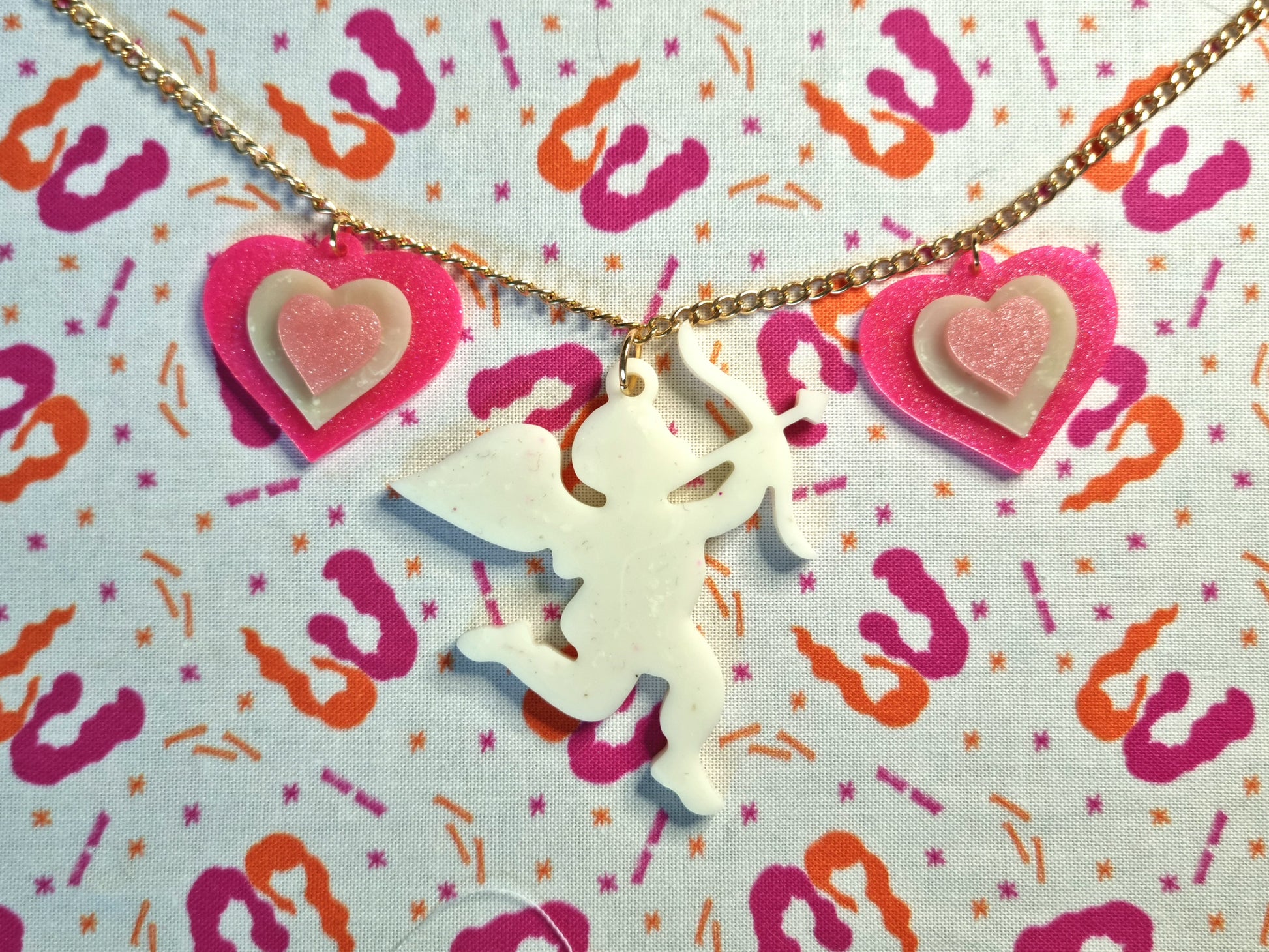 This necklace features cupid surrounded by soft pink stacked hearts, and we'd take an arrow through the heart any day for it