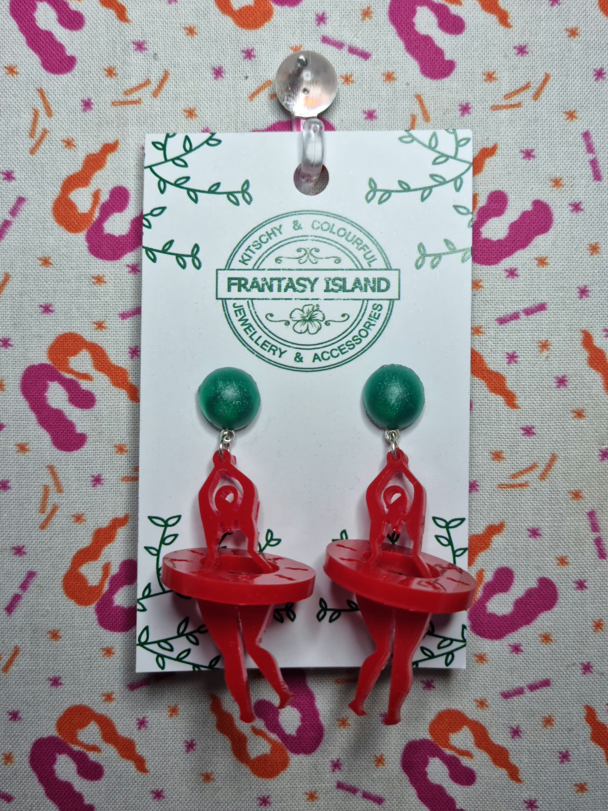 Take the plunge with these playful, bold, and statement-making curvy swimmer earrings! Featuring a swimmer's silhouette and life ring made from red resin, they'll are sure to make any of your outfits pop. Don't get stuck treading water - these are sure to make a splash!