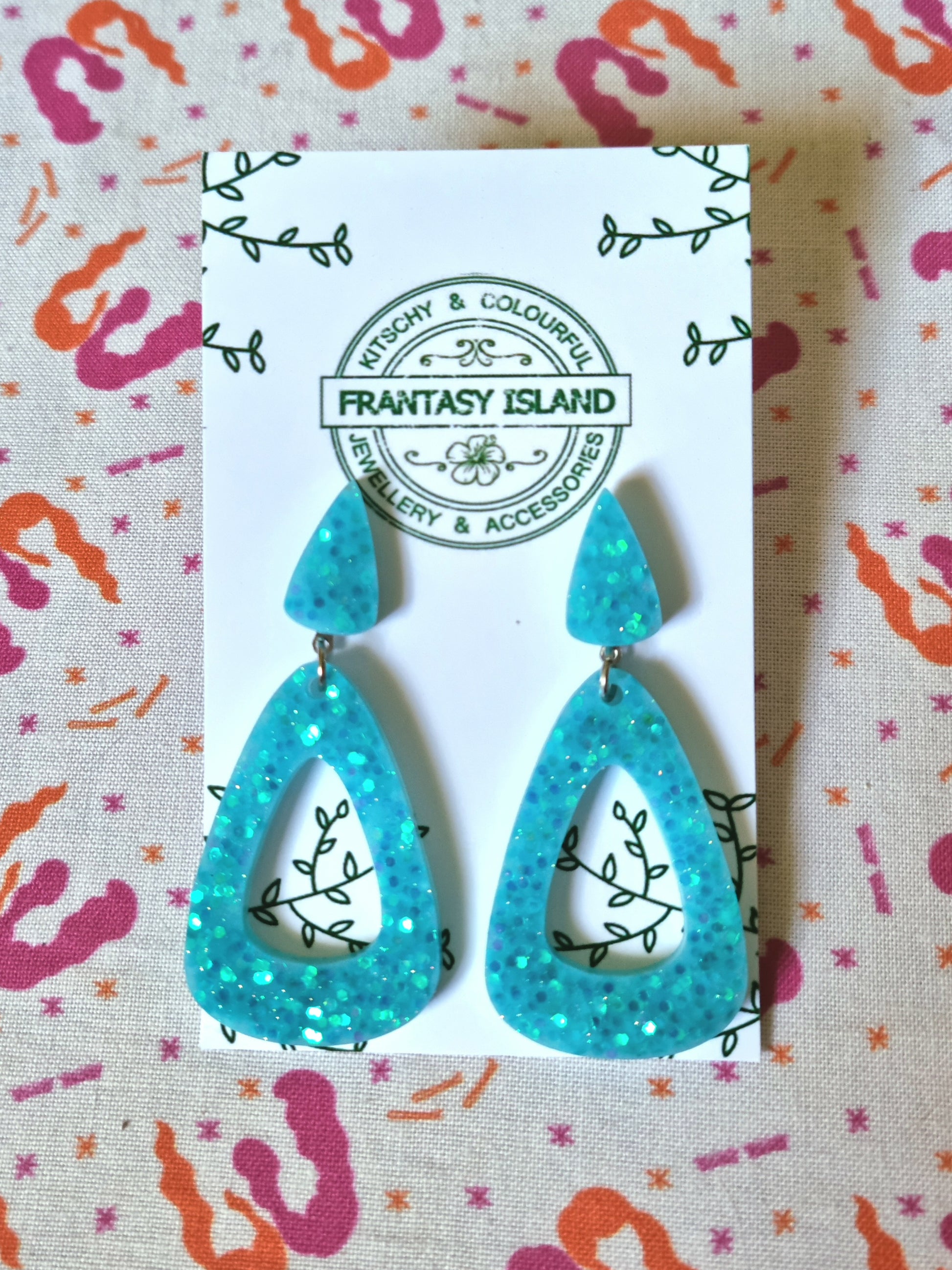 These spectacular teardrop earrings have a bright fresh feel, with an exaggerated retro shape and mixed blue holographic glitters set in electric blue resin - Perfect for any occasion.