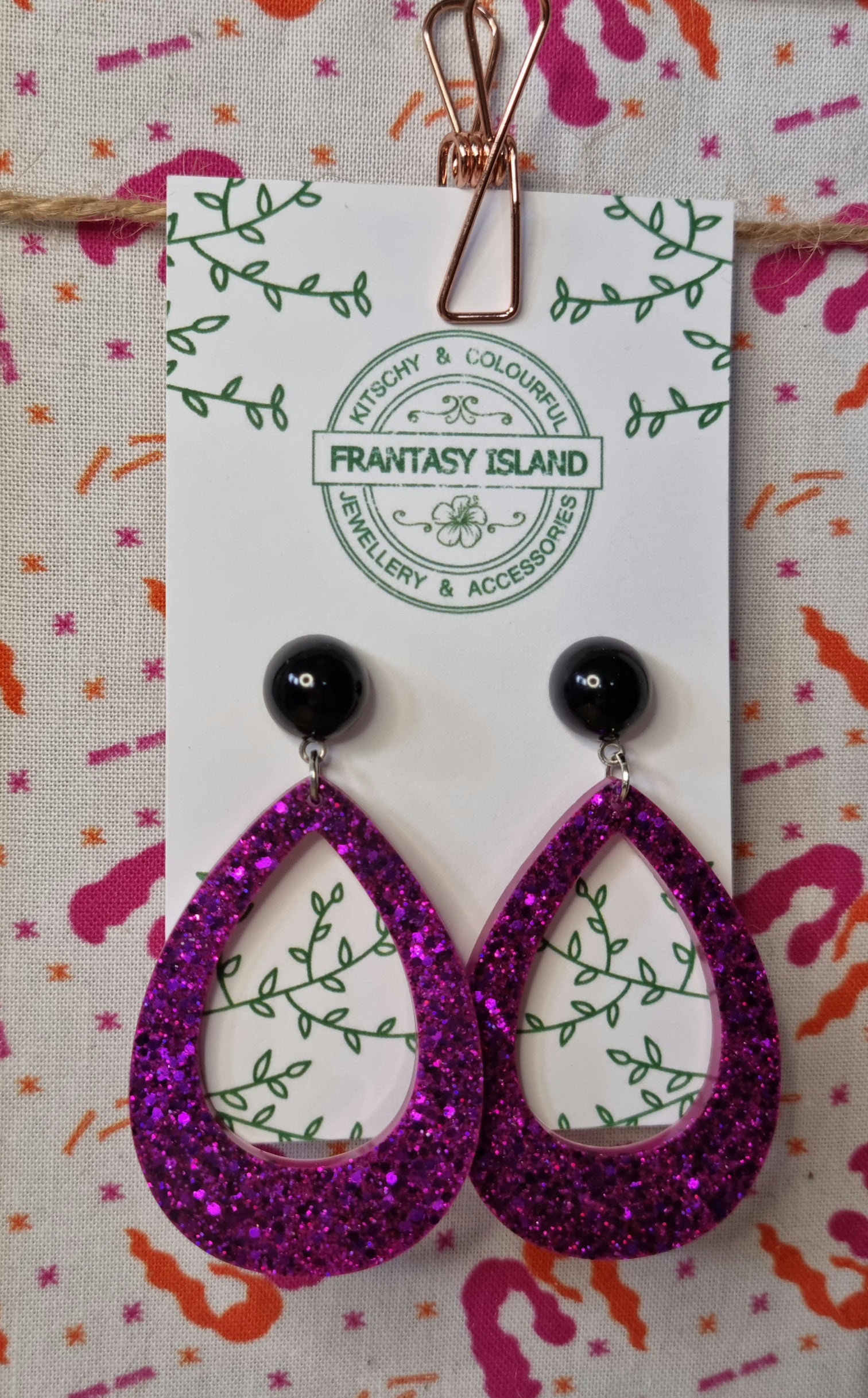 These bright and fun purple glitter earrings have an exaggerated retro shape, with black dome tops and bright purple and fuschia glitter set in translucent purple resin - Perfect for any occasion.