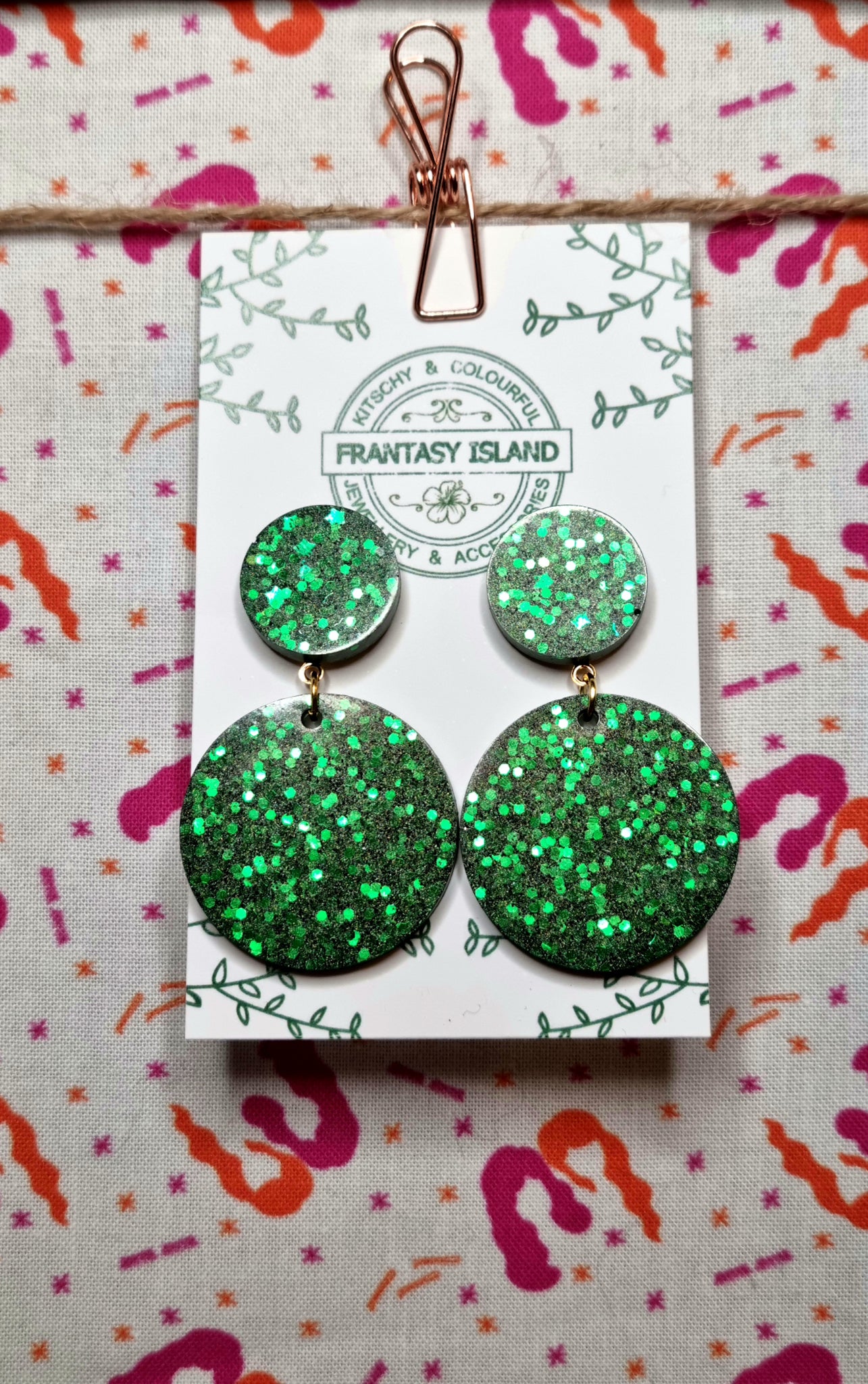These emerald green disc drops are about as glitzy as they come, with a classic retro shape and a mix of rich deep emerald glitters - Perfect for any occasion.