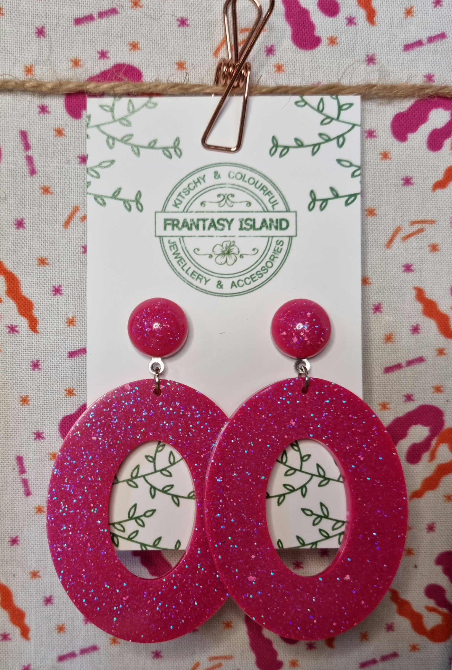 These vivid pink glitter teardrop earrings have a classic retro shape, with a blend of pink and white iridescent glitters set in deep pink resin - Perfect for any occasion.