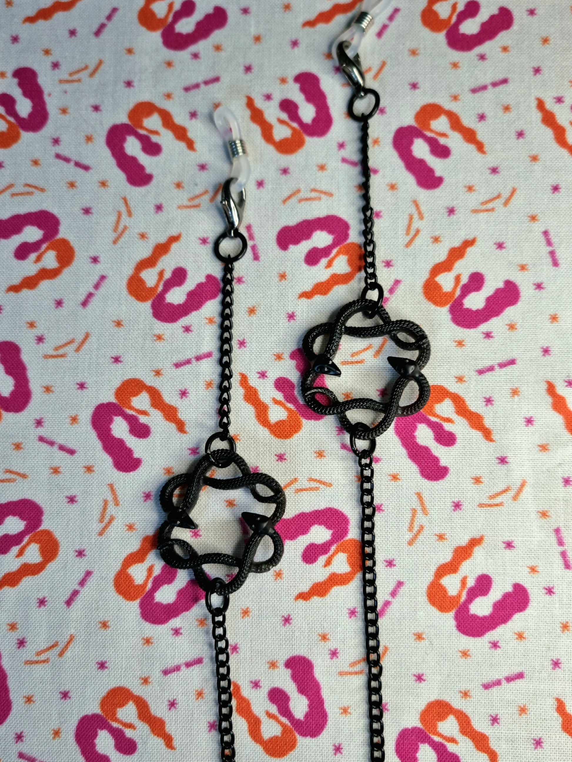 These particular chains are embellished with resin ouroboros snake hoops which look excellent at the temples of your glasses, or hanging from your mask ear loops like earrings.