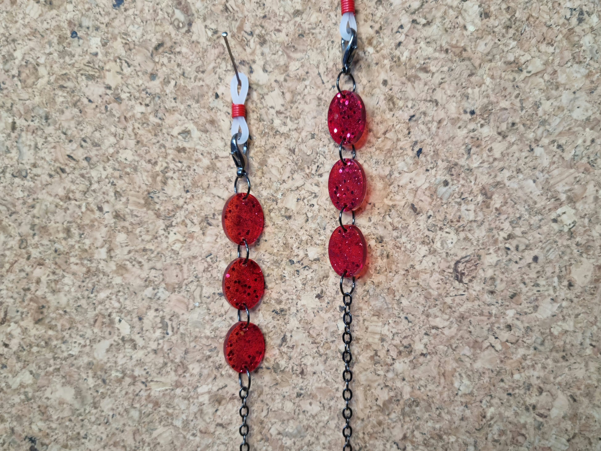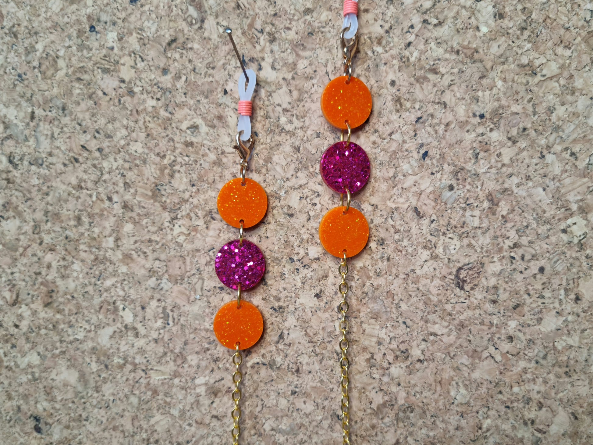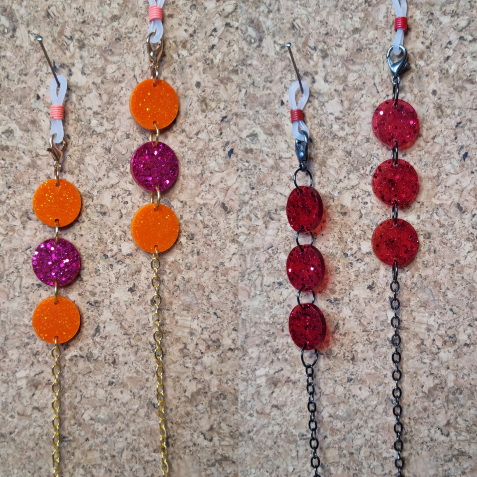 These particular chains are embellished with handmade resin beads, which look excellent at the temples of your glasses, or hanging from your mask ear loops like earrings.