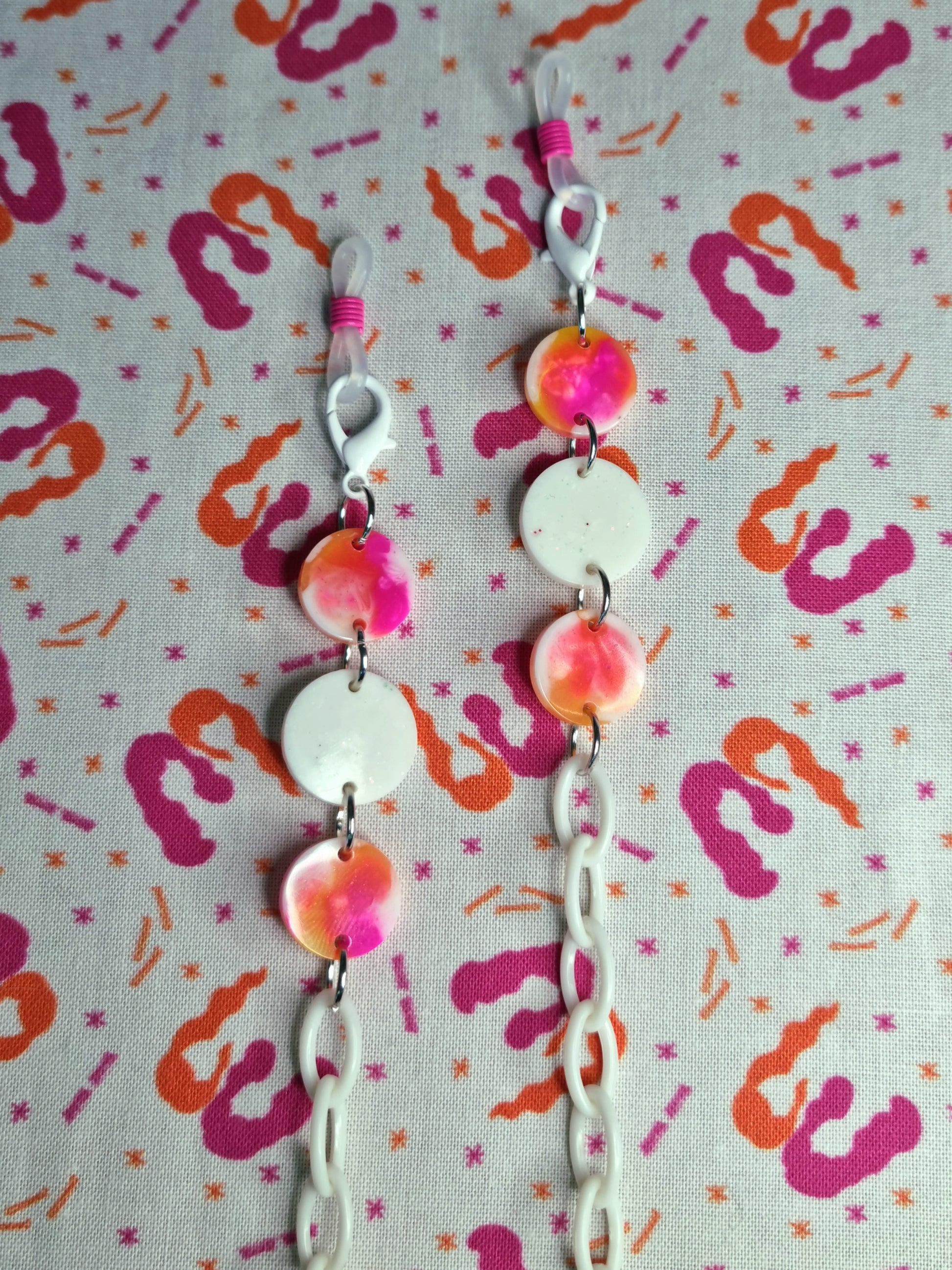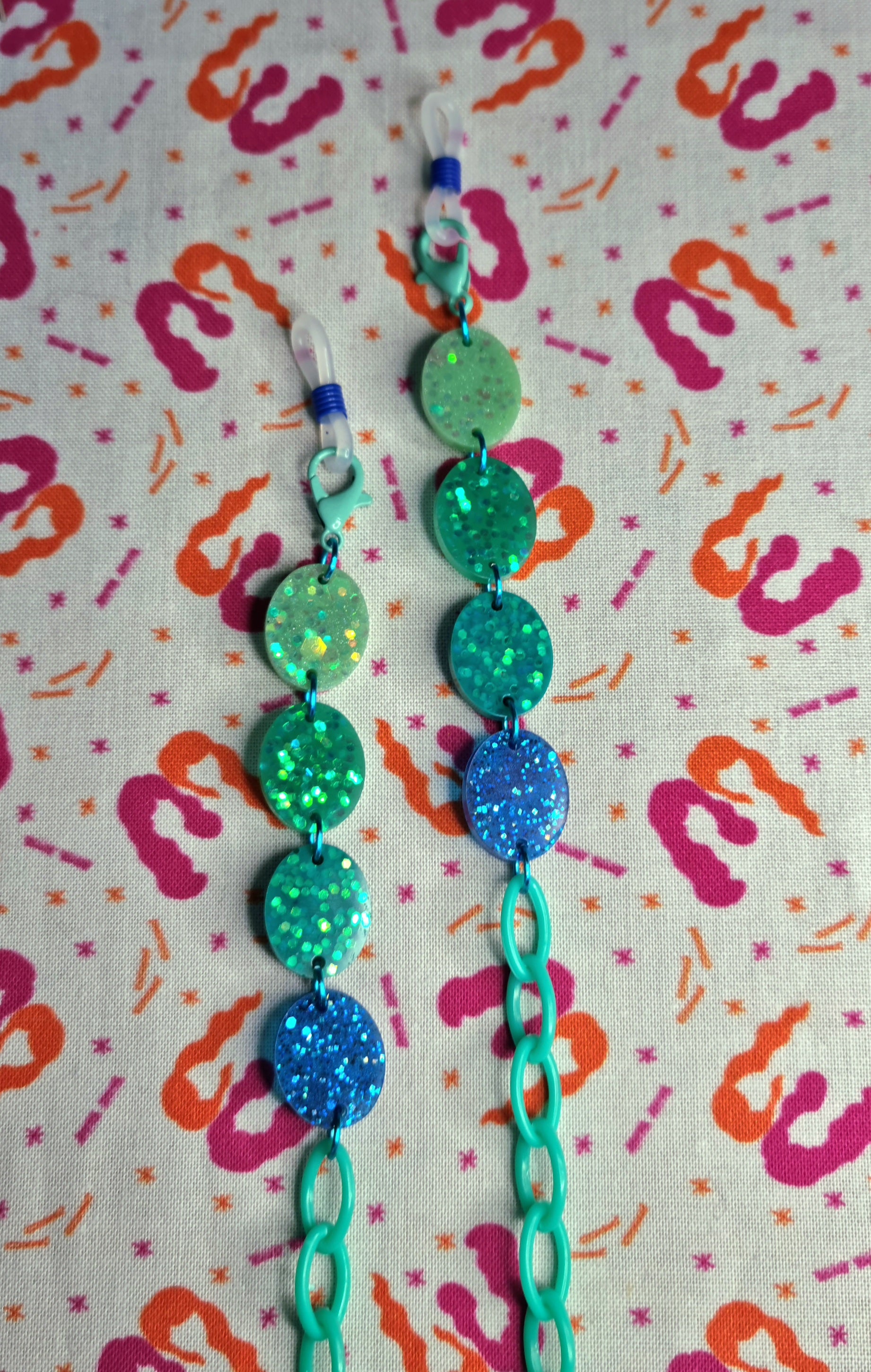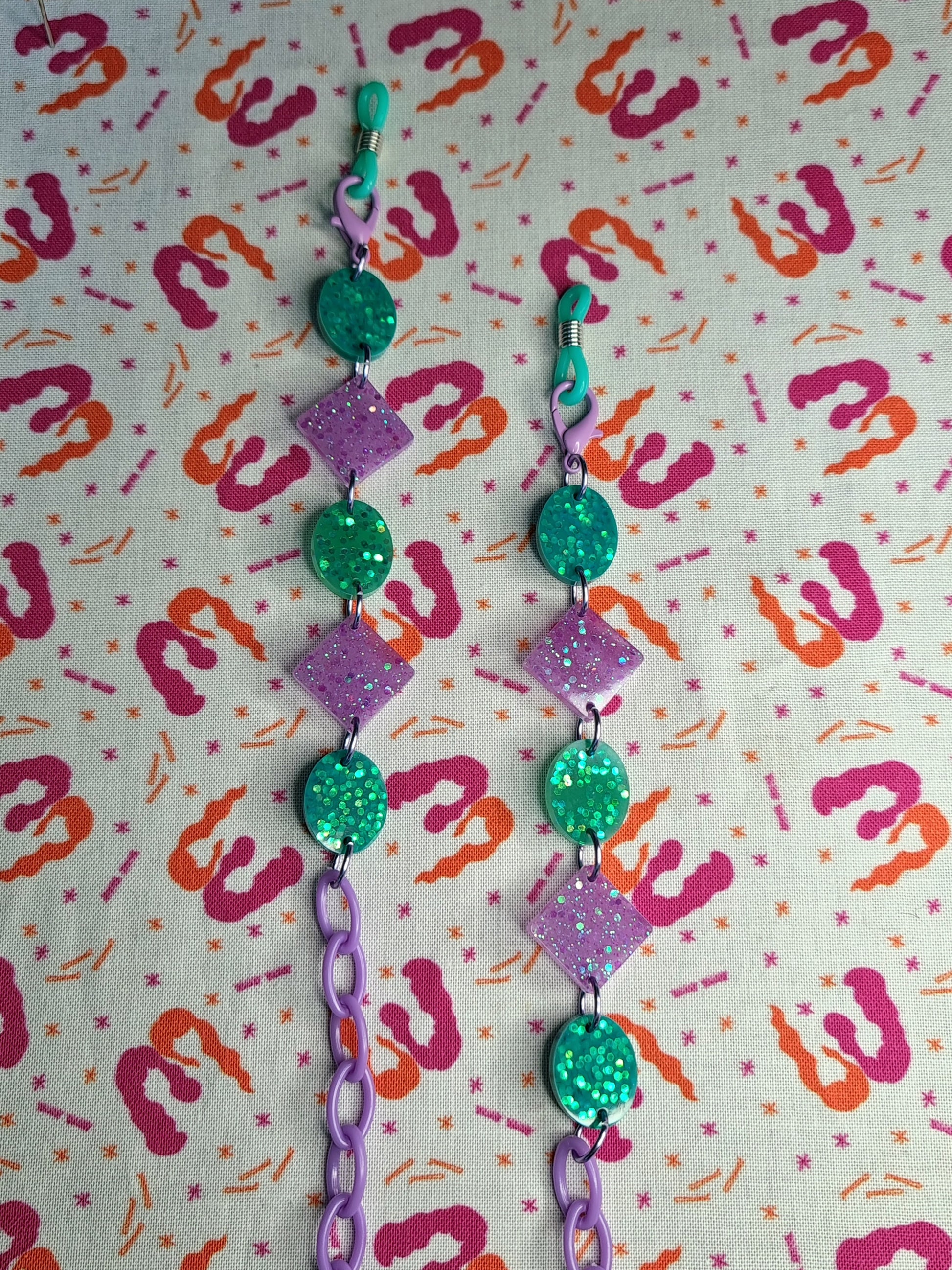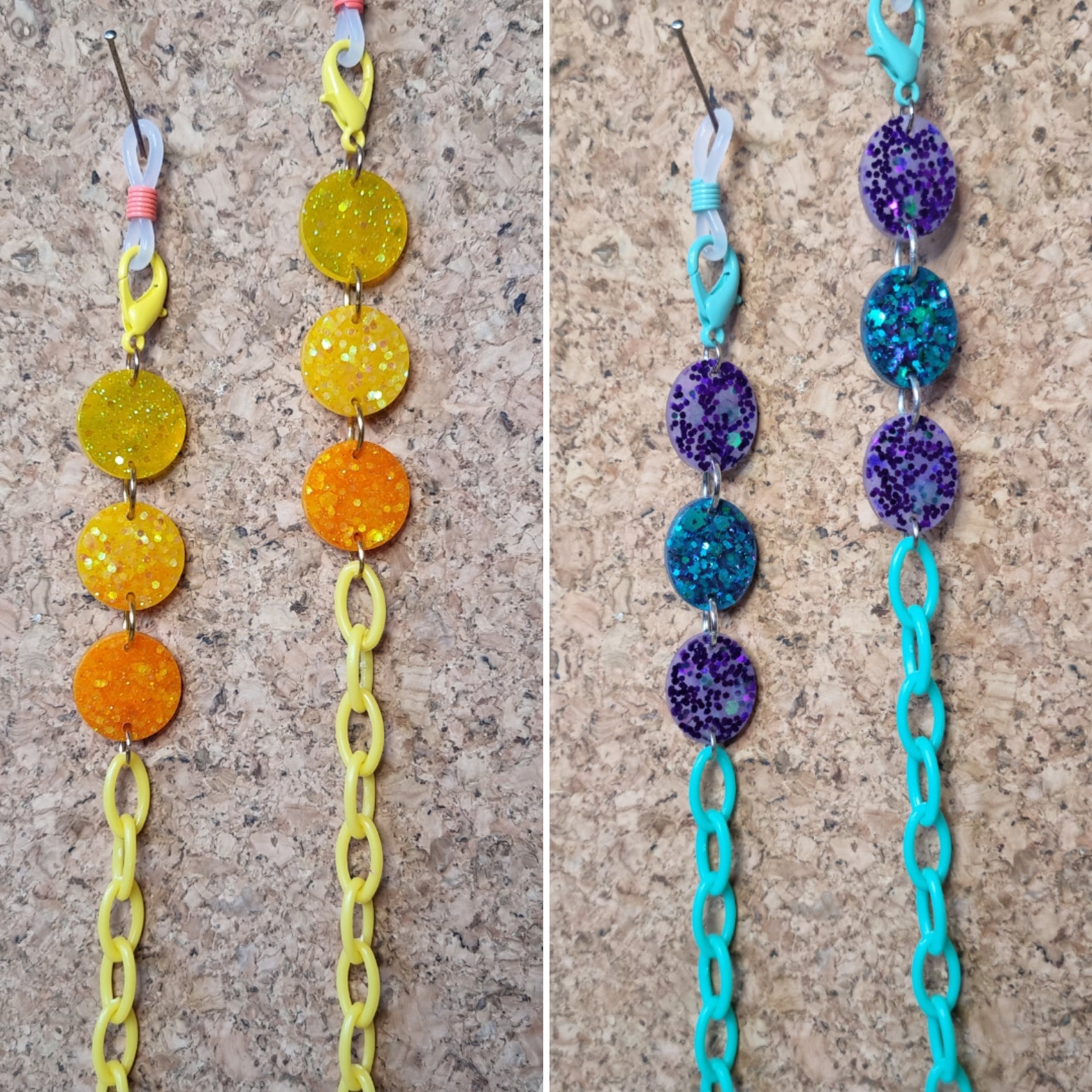 These particular chains are made from brightly coloured acrylic embellished with handmade resin beads, which look excellent at the temples of your glasses, or hanging from your mask ear loops like earrings.