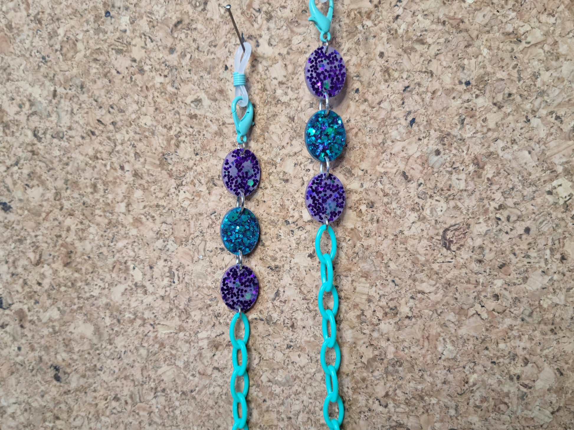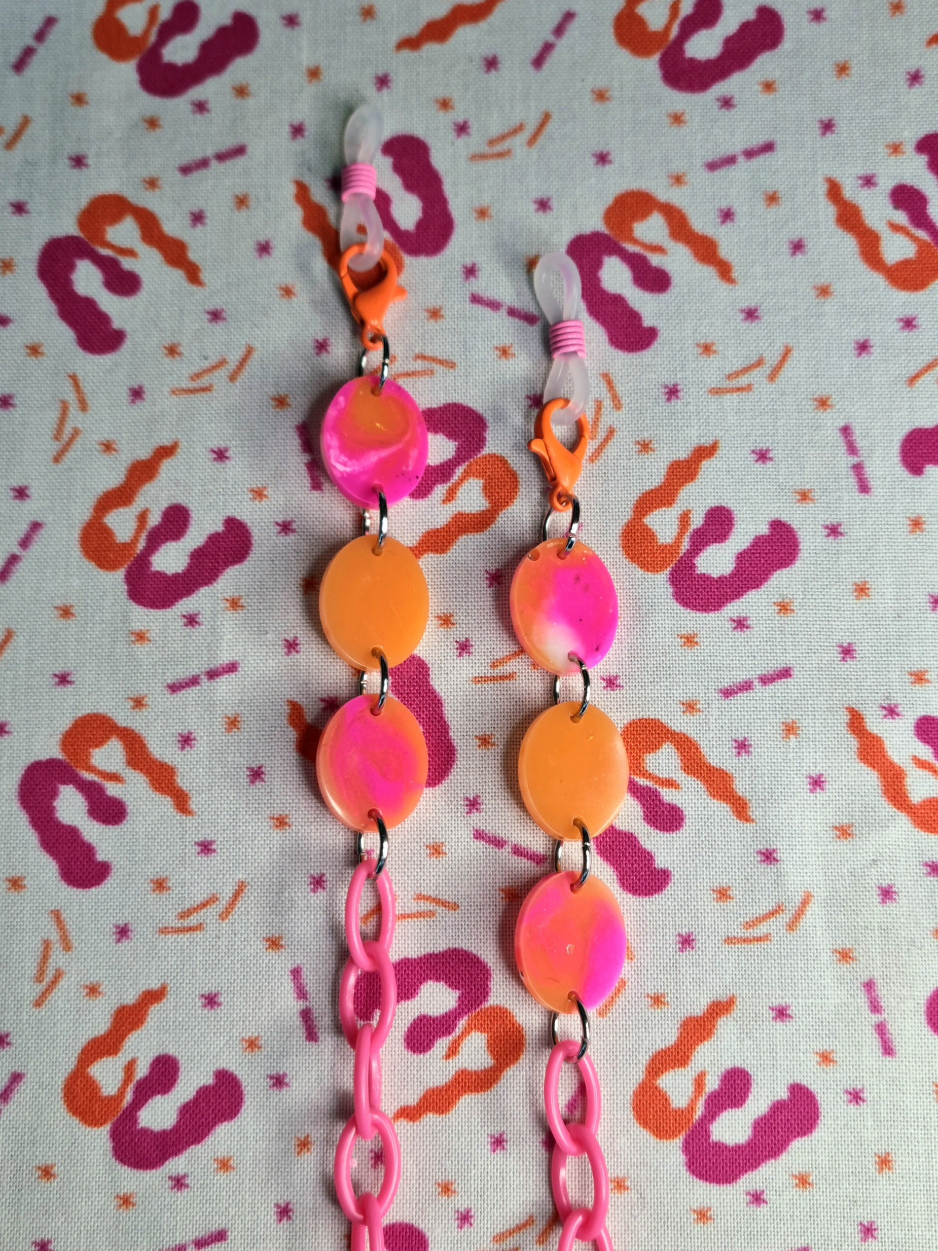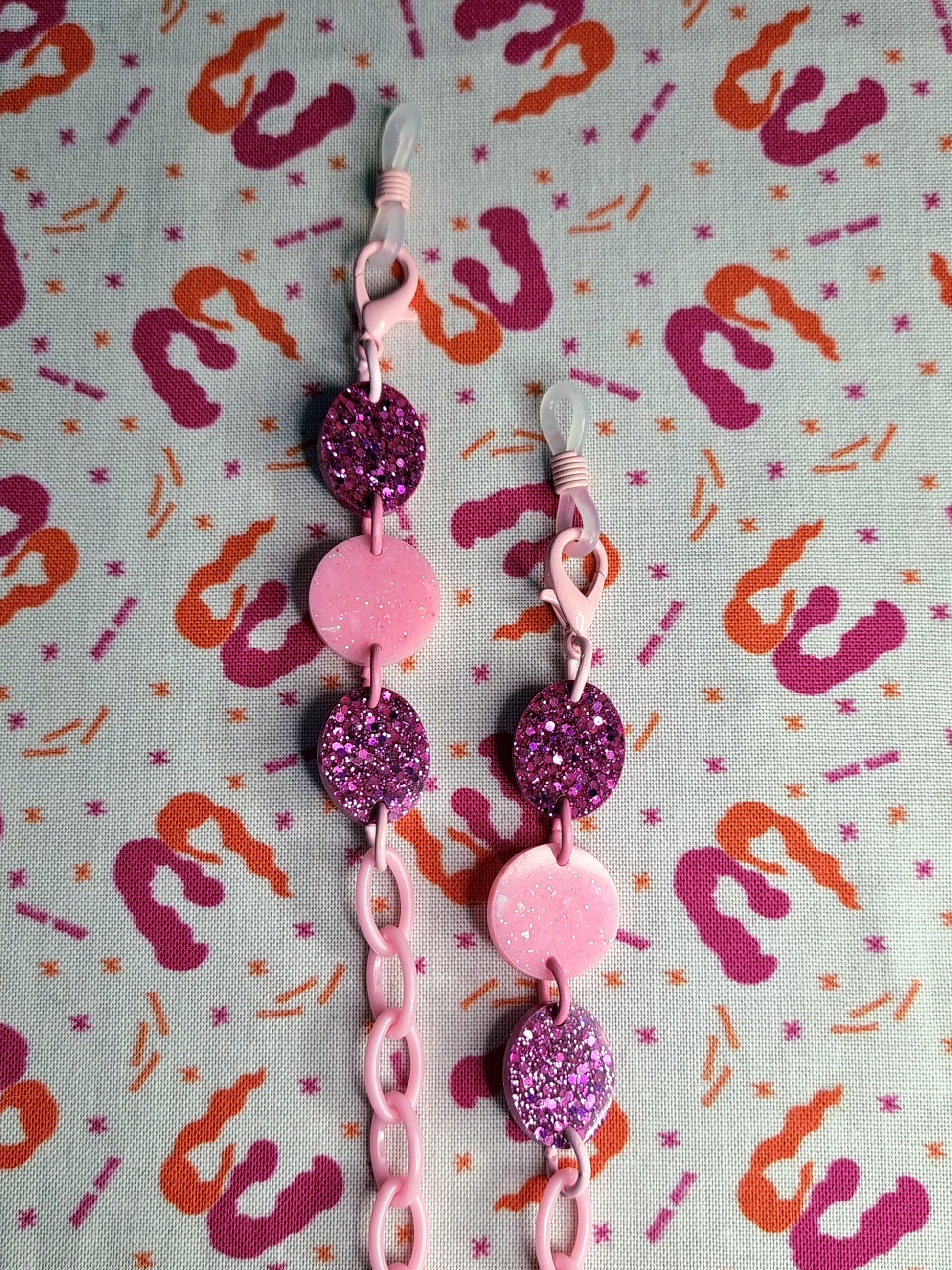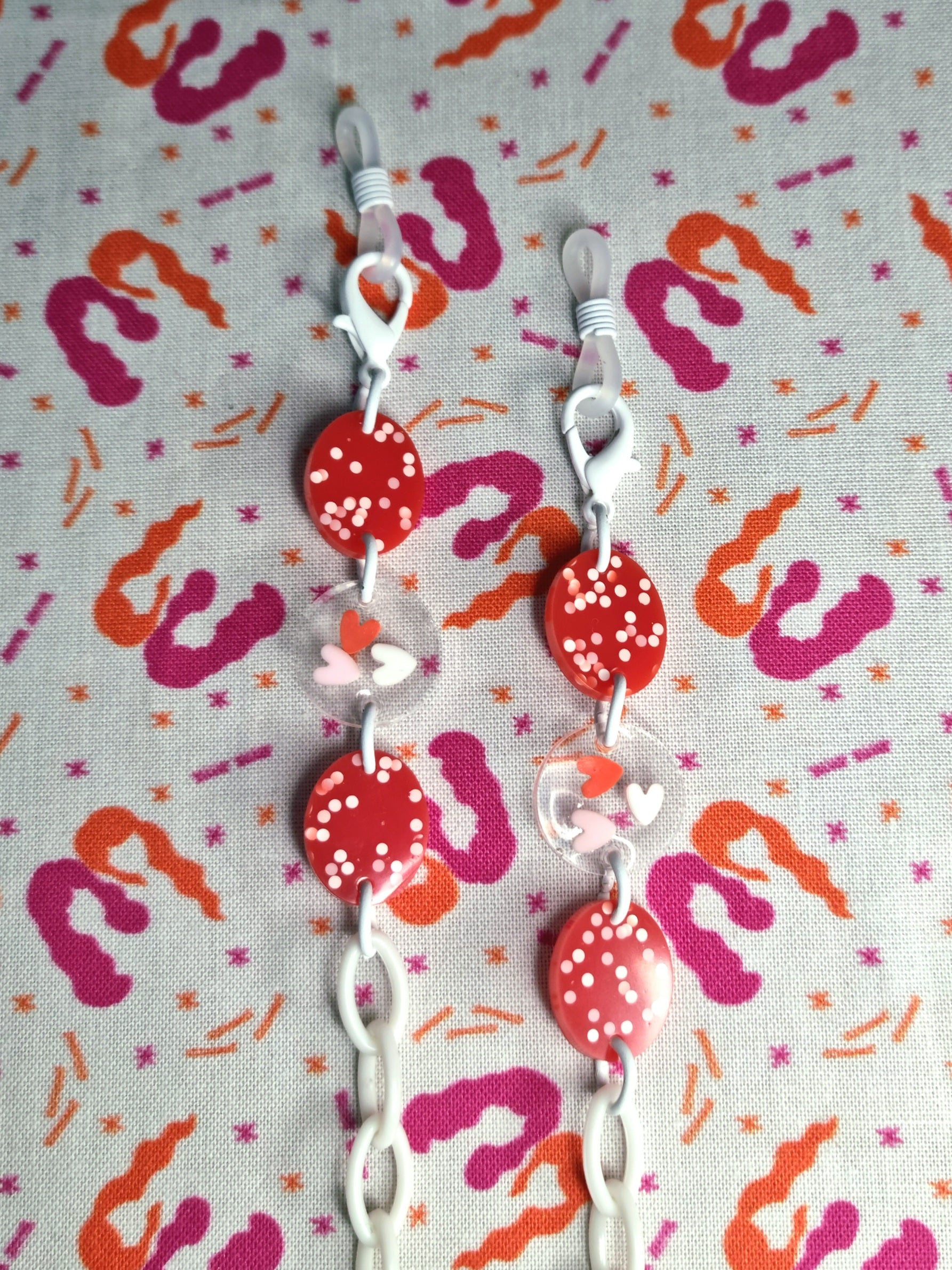 These particular chains are made from brightly coloured acrylic embellished with handmade resin beads, which look excellent at the temples of your glasses, or hanging from your mask ear loops like earrings.