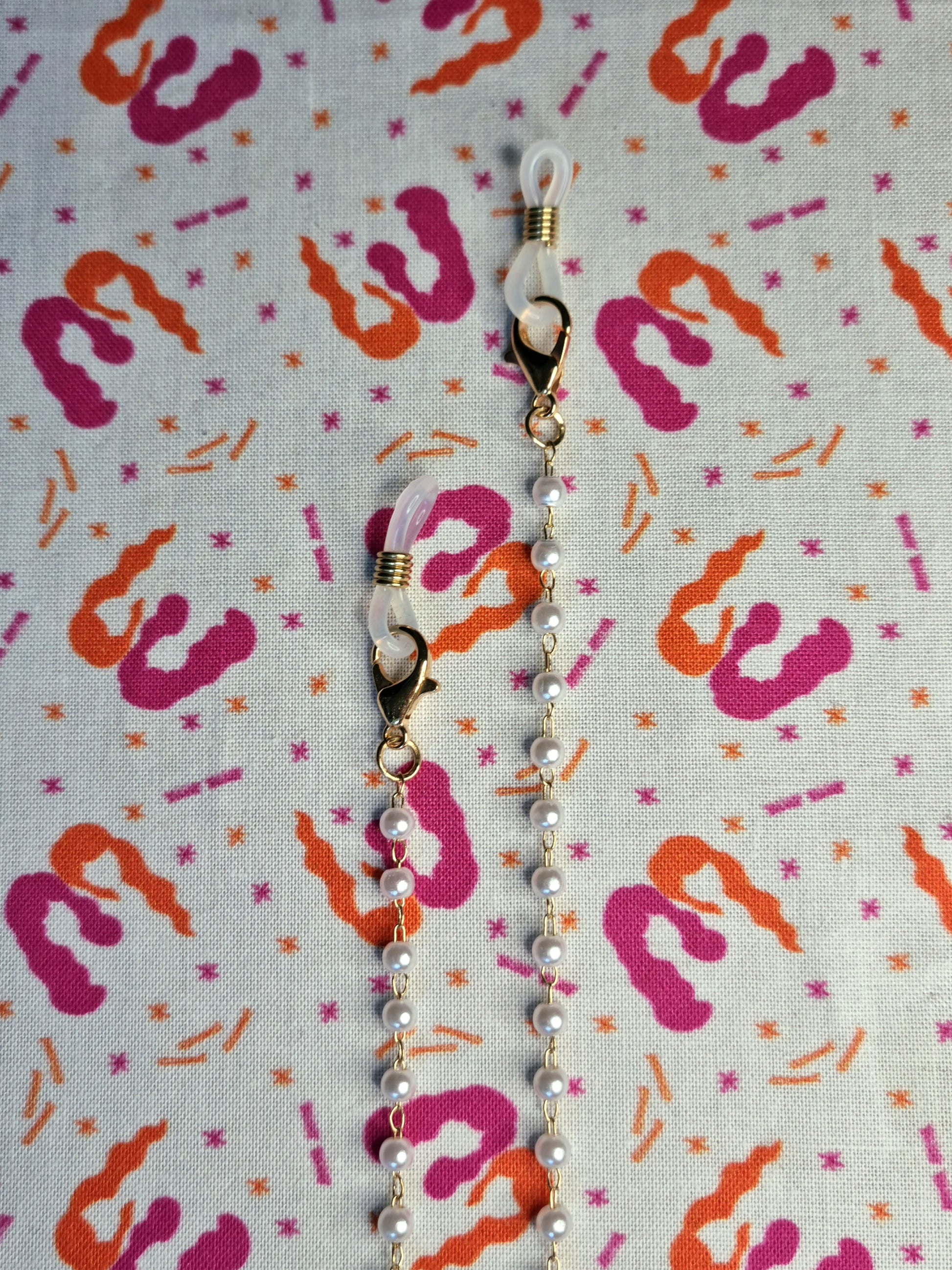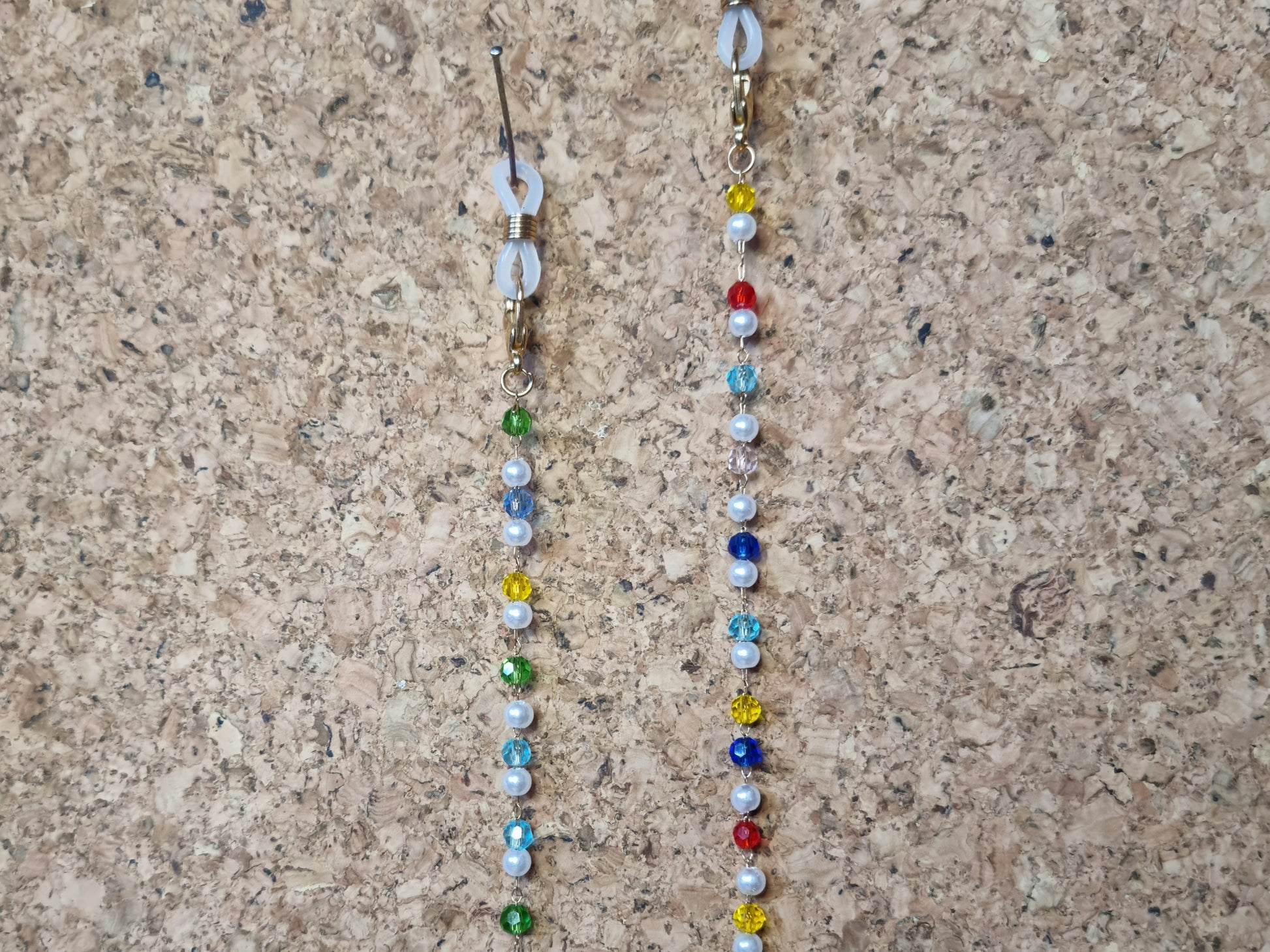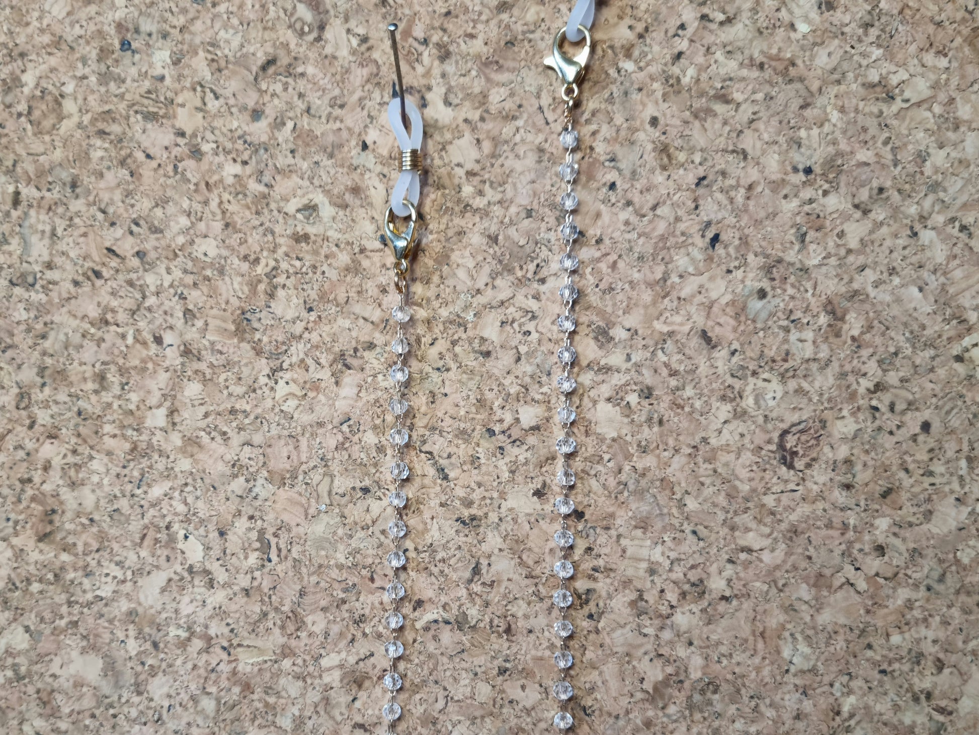 These particular chains are embellished with crystal and pearl beads, which look excellent at the temples of your glasses, or hanging from your mask ear loops like earrings.