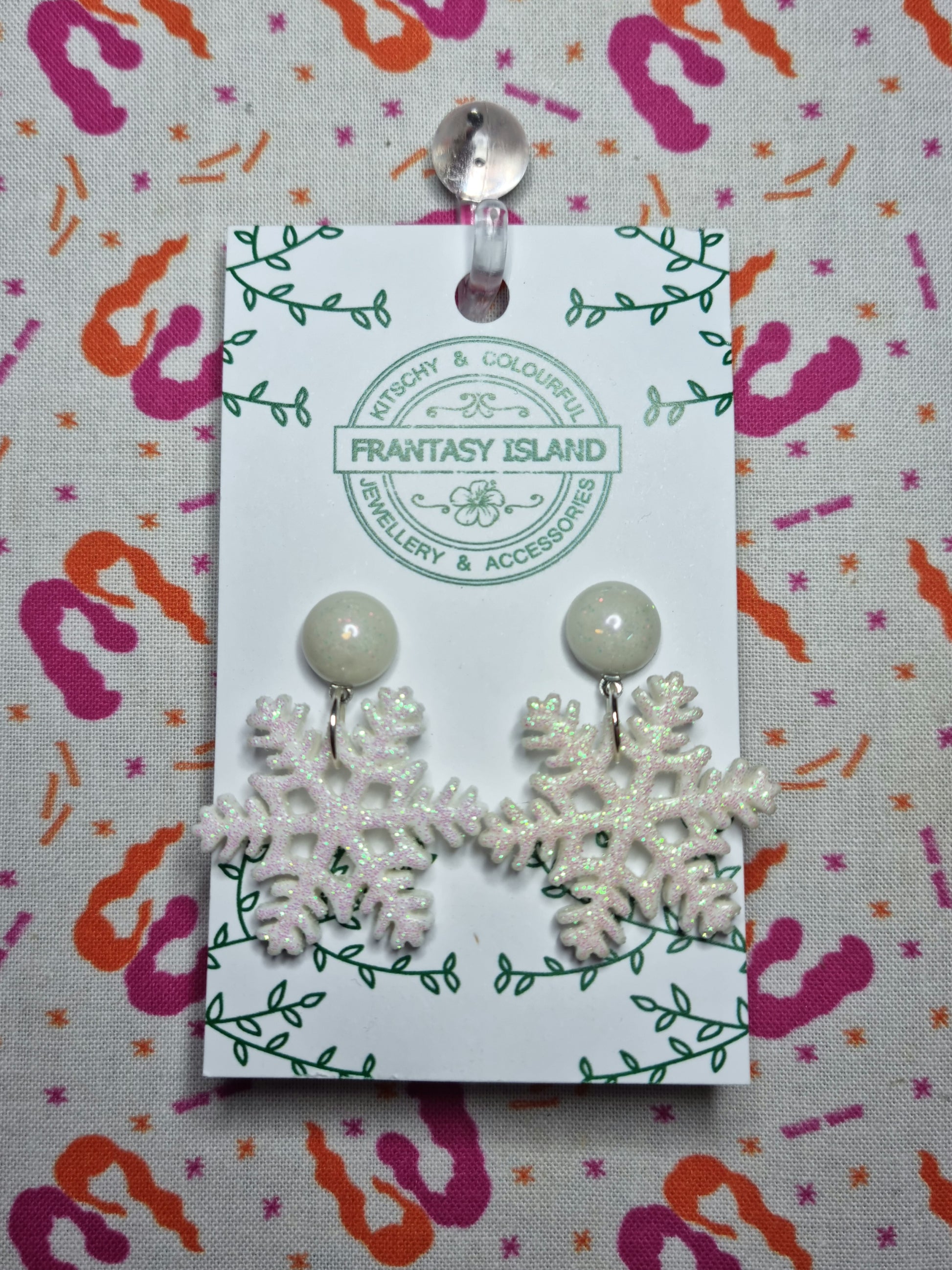 These iridescent white glitter snowflake earrings with glossy domes are an excellent match for our 'Winter Wonderland' collection - Perfect for any occasion.