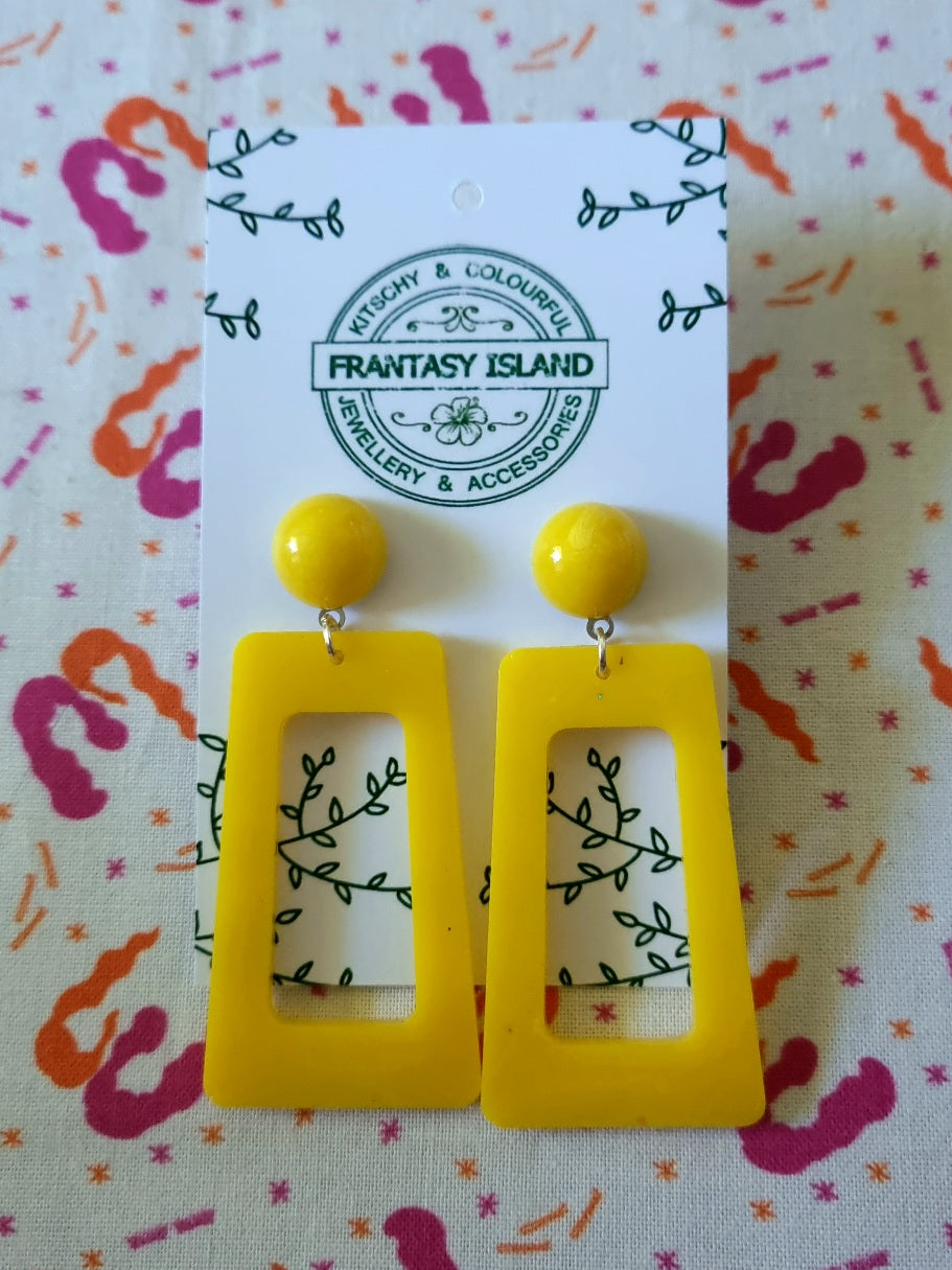 These funky yellow earrings have an exaggerated retro shape in buttery yellow resin - Perfect for any occasion.