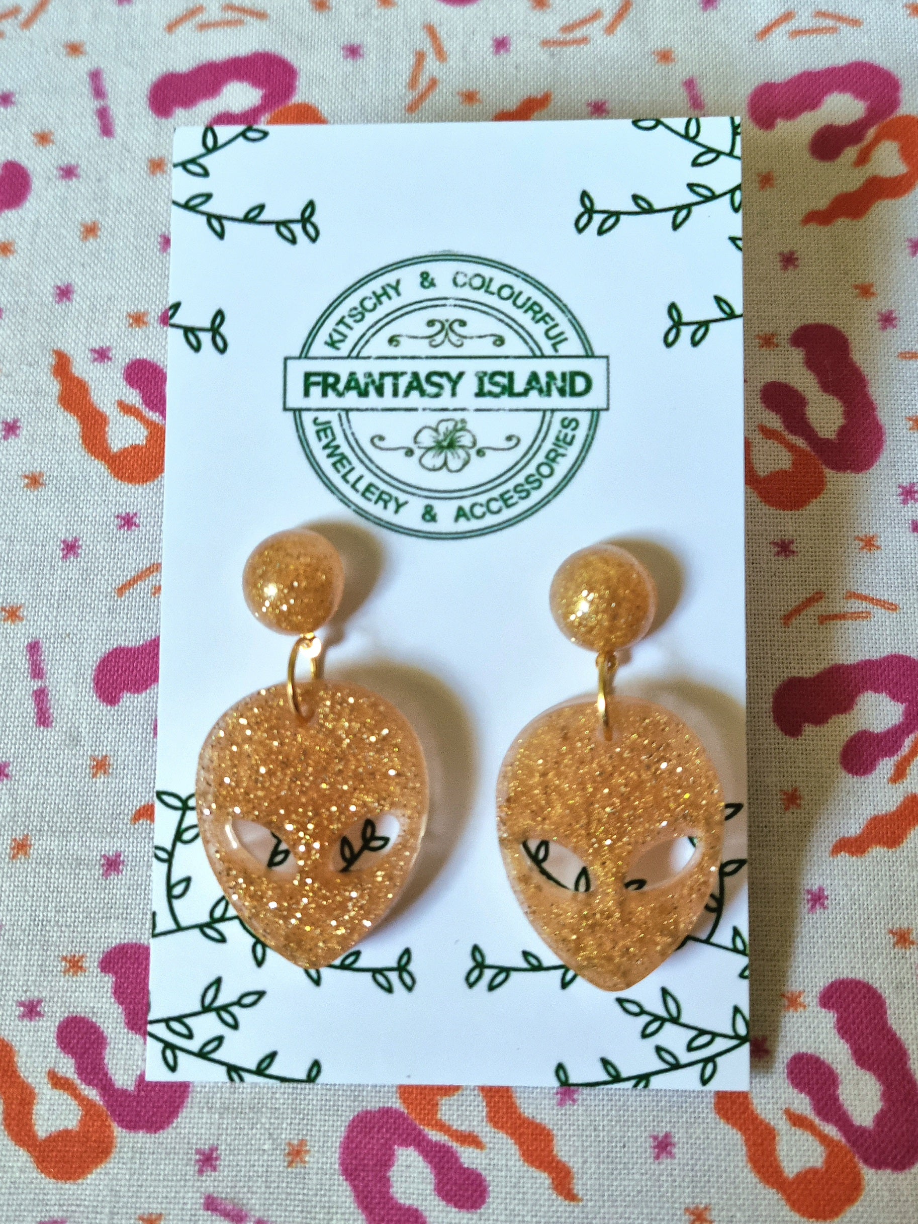 Now, we know we're good at glamorous sparkly things, but we're also really good at quirky nonsense, and these gold glitzy Alien drop earrings are exactly that - Quirky sparkly nonsense, perfect for any occasion