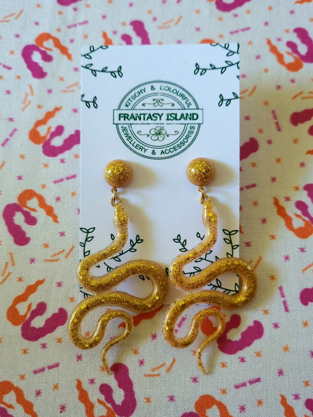 These spectacular snake drop earrings are full of gold glitter, set in shimmering golden resin - Perfect for any occasion.