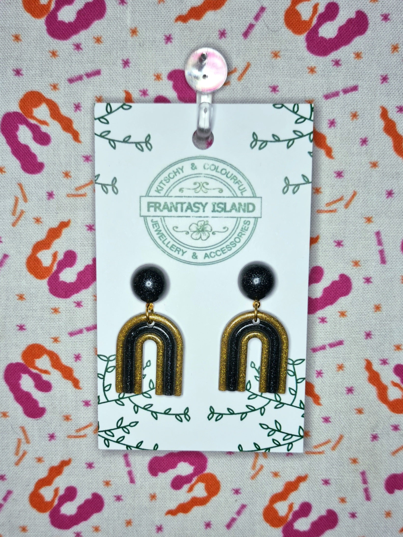 These spectacular deep antique gold arch drop earrings are about as glitzy as they come, with a classic retro shape and a blend of gold glitters set in a warm metallic mustard resin - Perfect for any occasion.