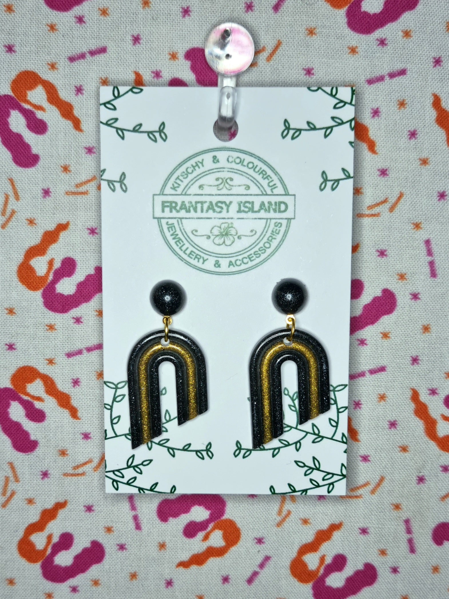 These spectacular deep antique gold arch drop earrings are about as glitzy as they come, with a classic retro shape and a blend of gold glitters set in a warm metallic mustard resin - Perfect for any occasion.