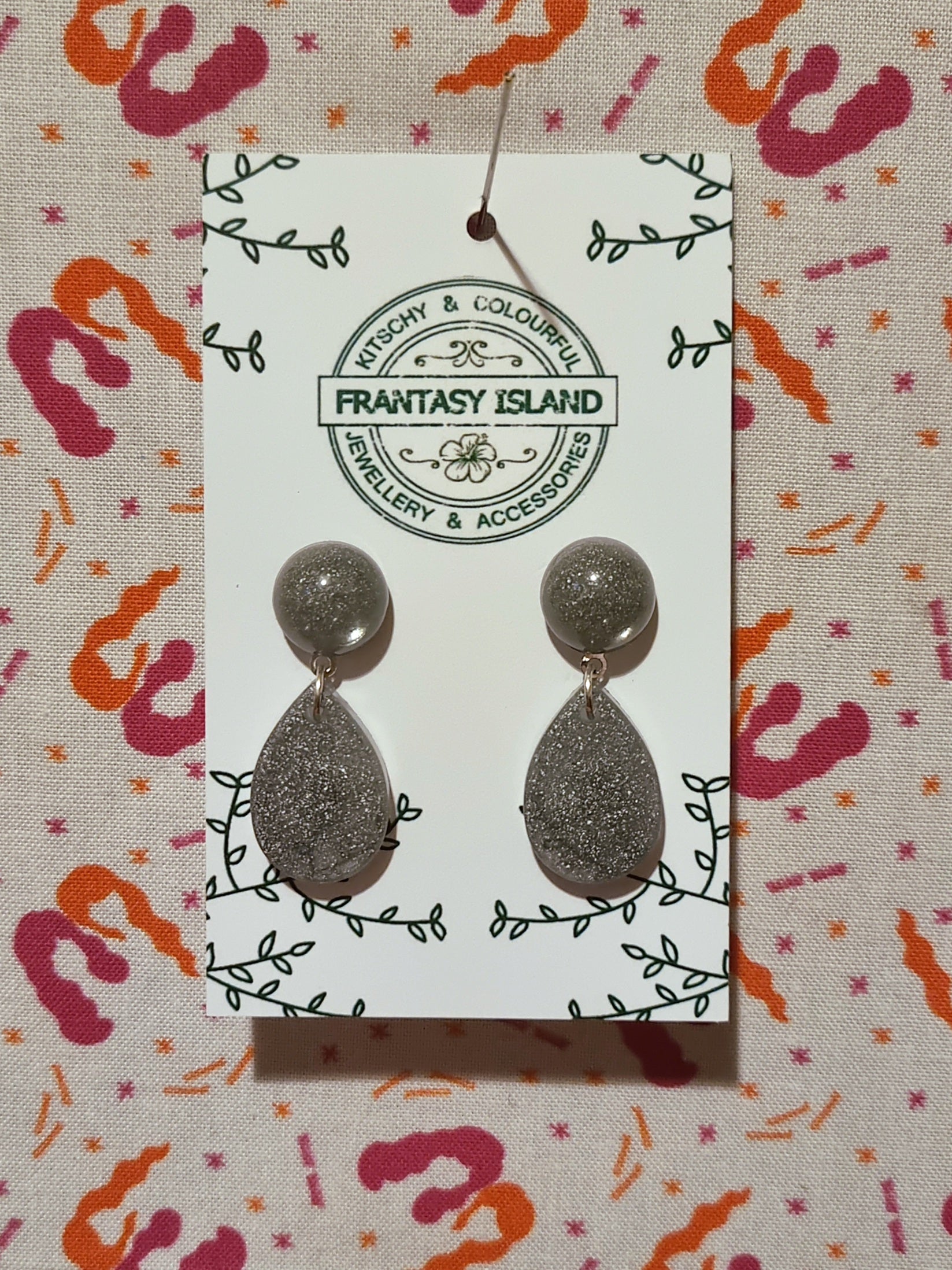 These gunmetal arch shaped drops are super glamorous, with an exaggerated retro shape and a mix of deep grey shimmering pigments set in glossy grey resin - Perfect for any occasion.