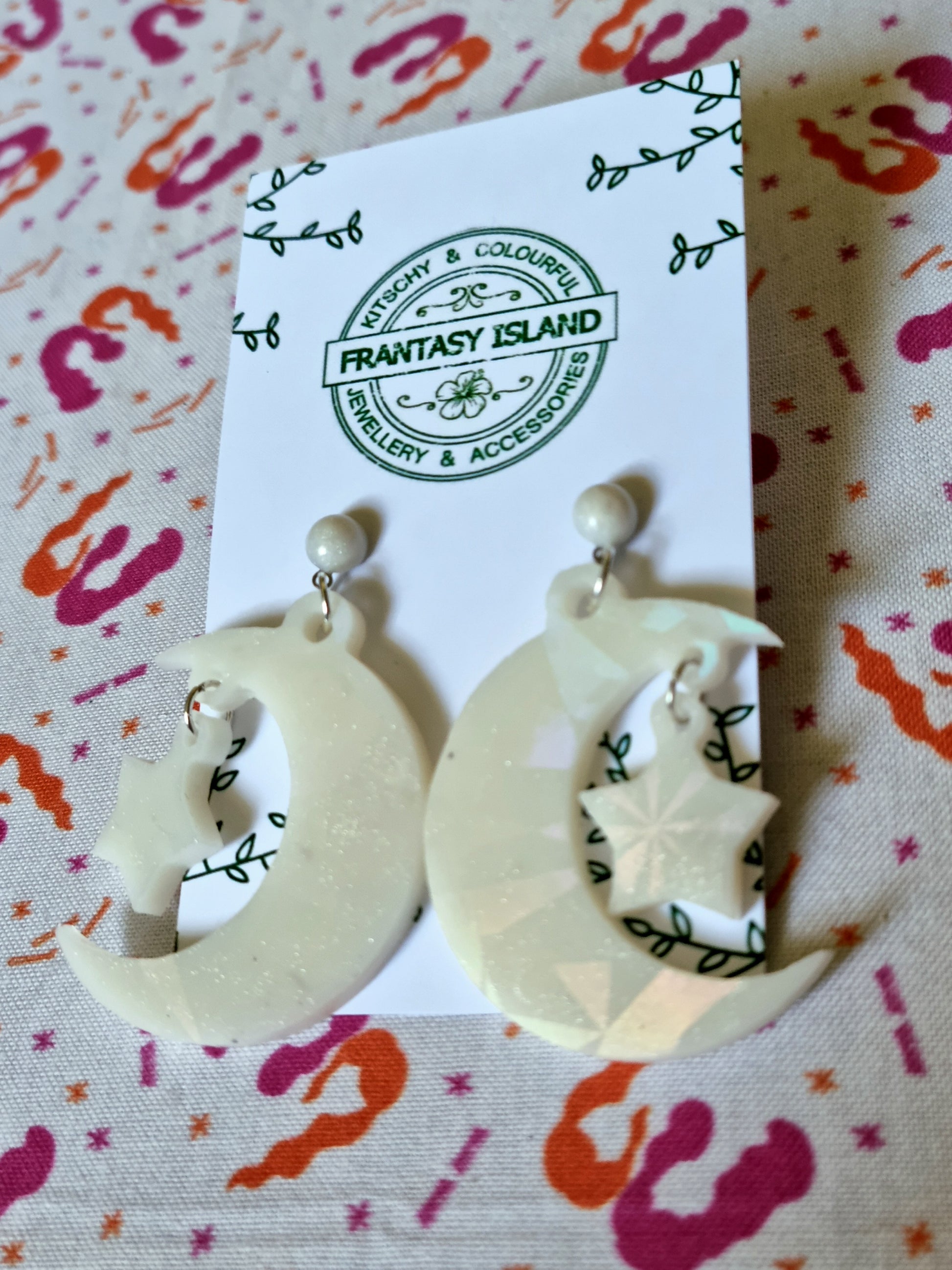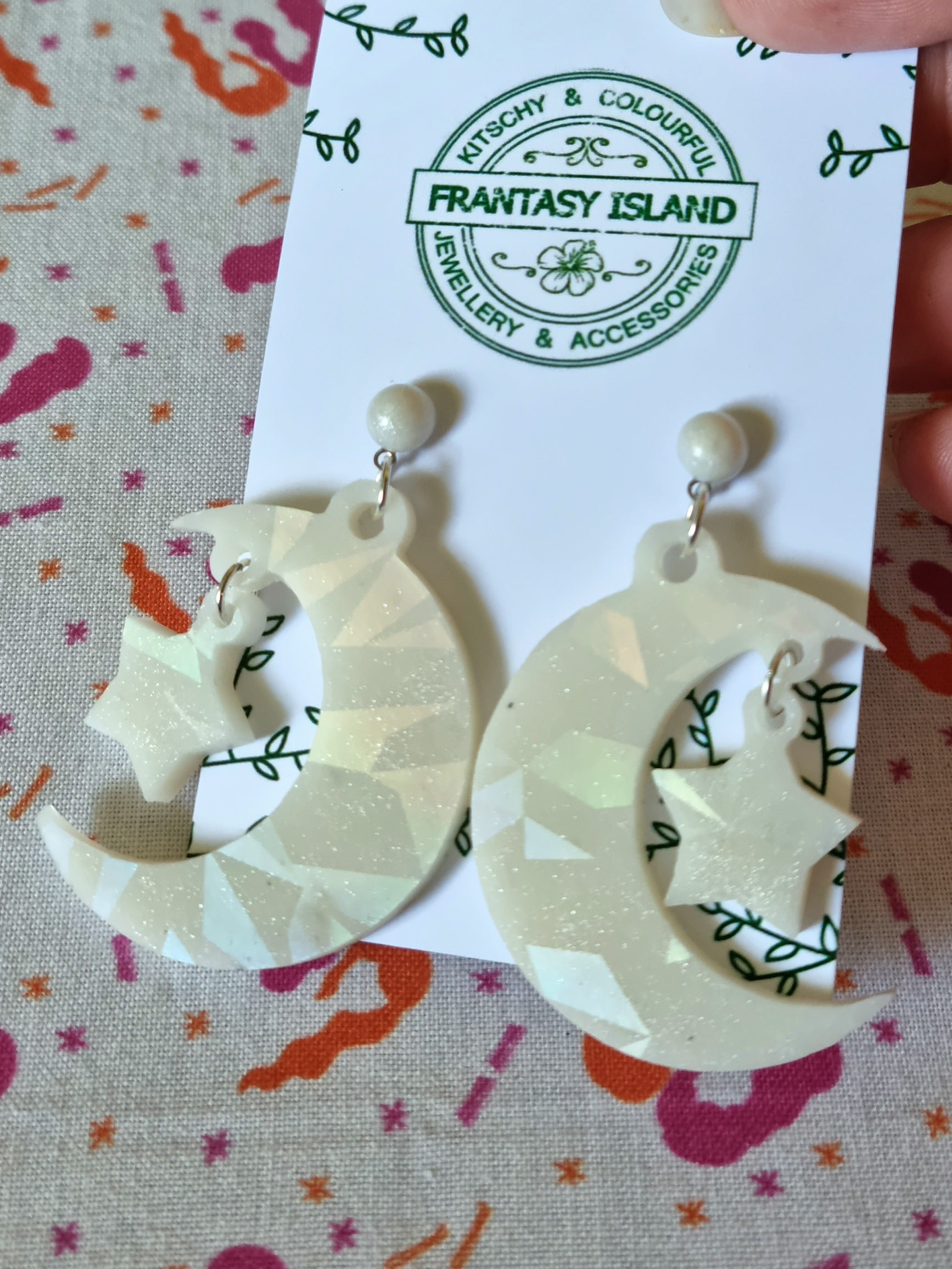 These spectacular star and moon earrings are about as glitzy as they come, but mostly because science is incredible - The resin for these was poured on a diffraction grating film to cure, so rather than glitter or a foil inclusion, the actual surface of the resin is holographic! Science is cool y'all, and these are a prime example of why.