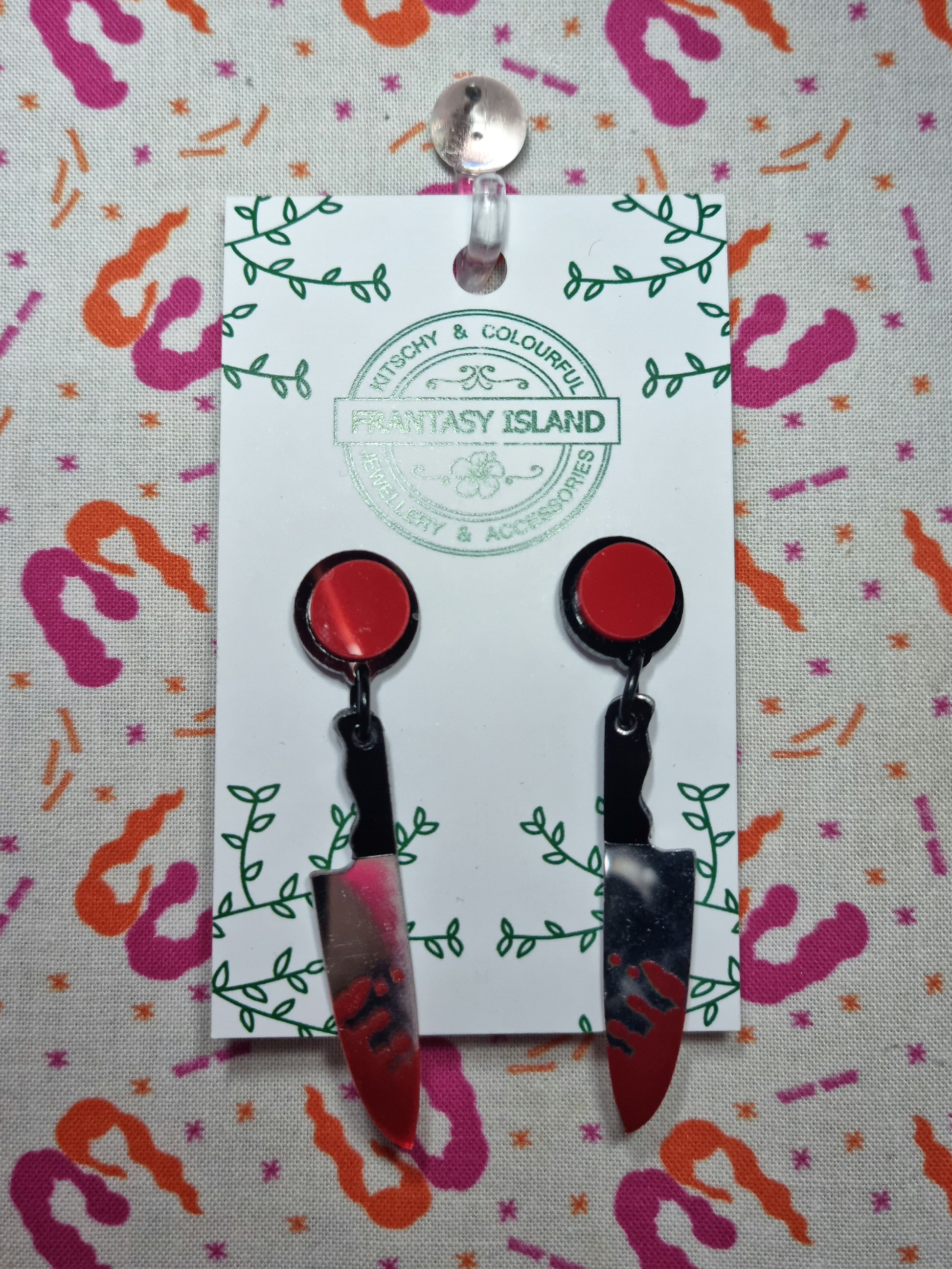 These knives are laser cut from black and silver mirrored acrylic flecked with 'blood', and are truly perfect for any occasion