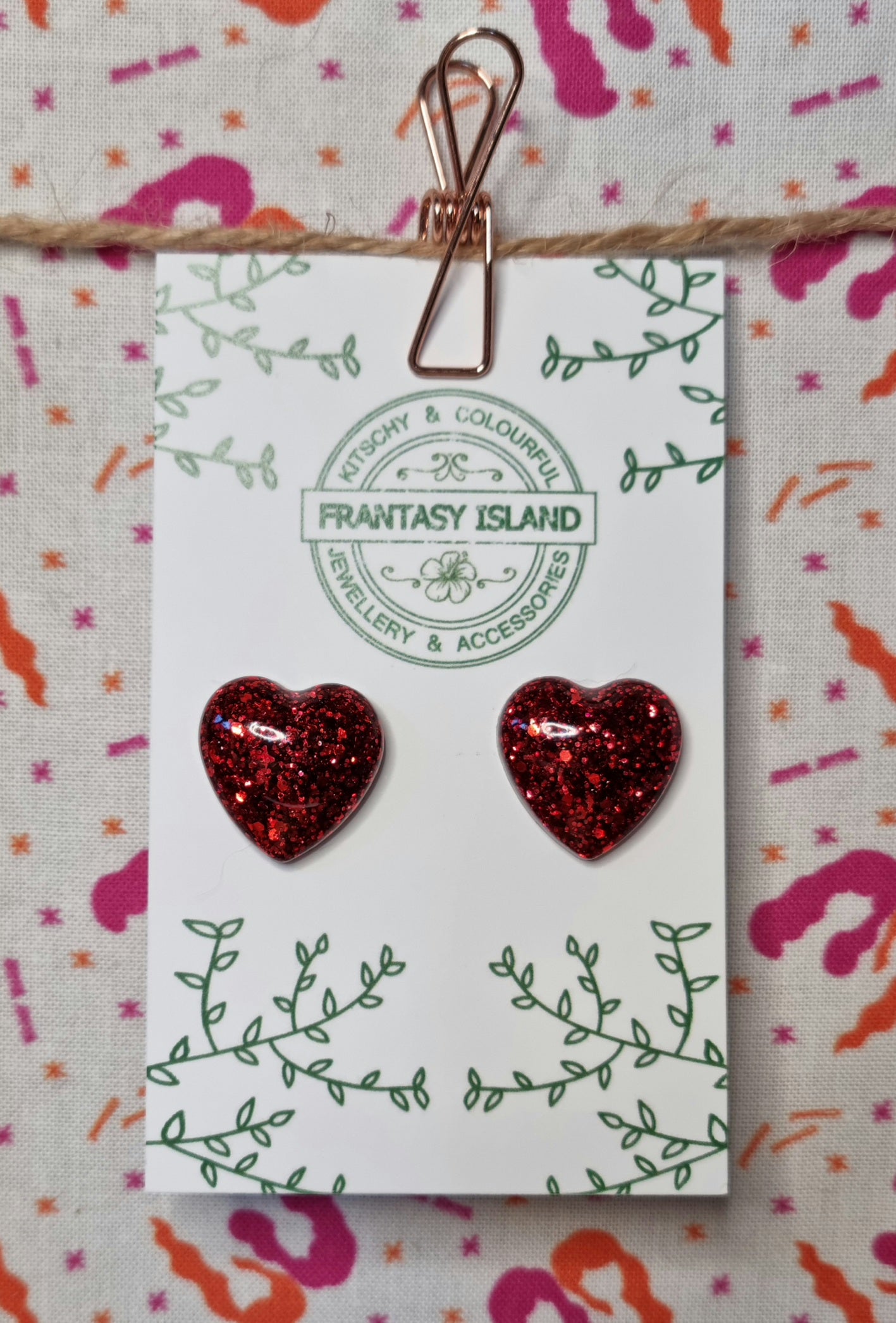 These cute earrings have an exaggerated heart shape, with red glitter in red shimmery resin - Perfect for any occasion.