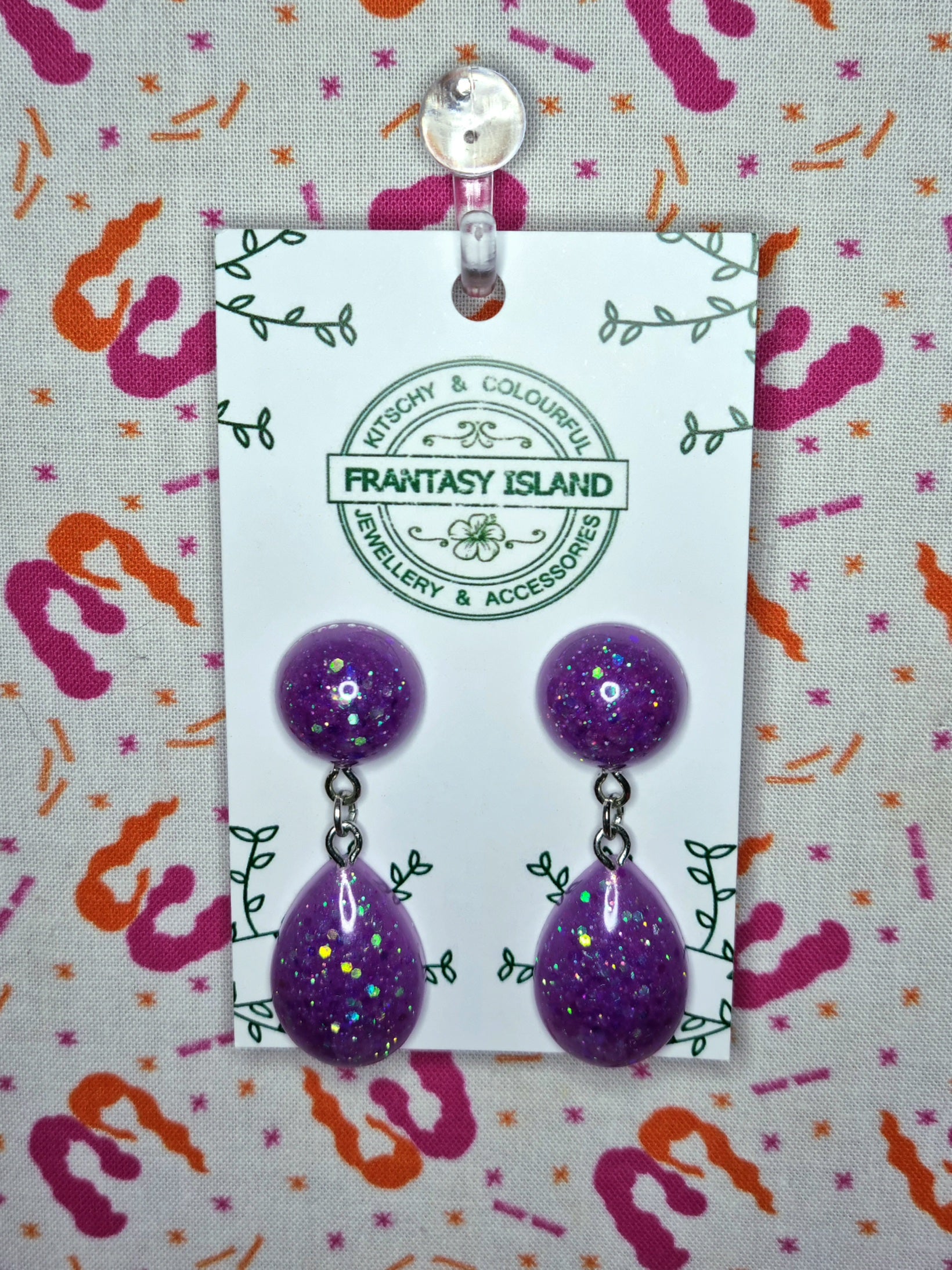 These bright and fun lilac glitter teardrop earrings have an exaggerated retro shape, with iridescent glitter set in purple resin - Perfect for any occasion.
