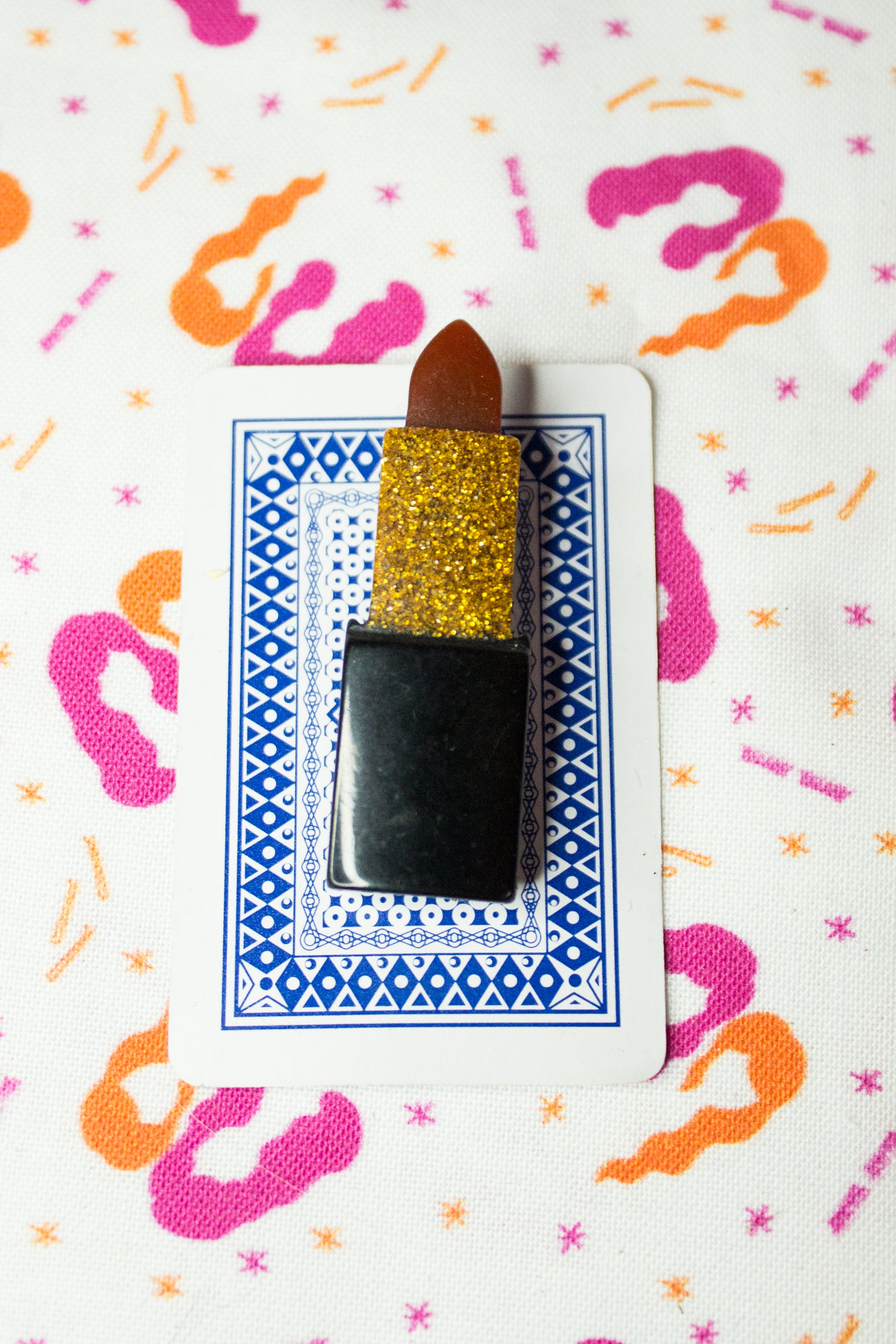 Adorable glittery lipstick pins, to show the world you really love makeup (even if nobody is paying you to put your face on)