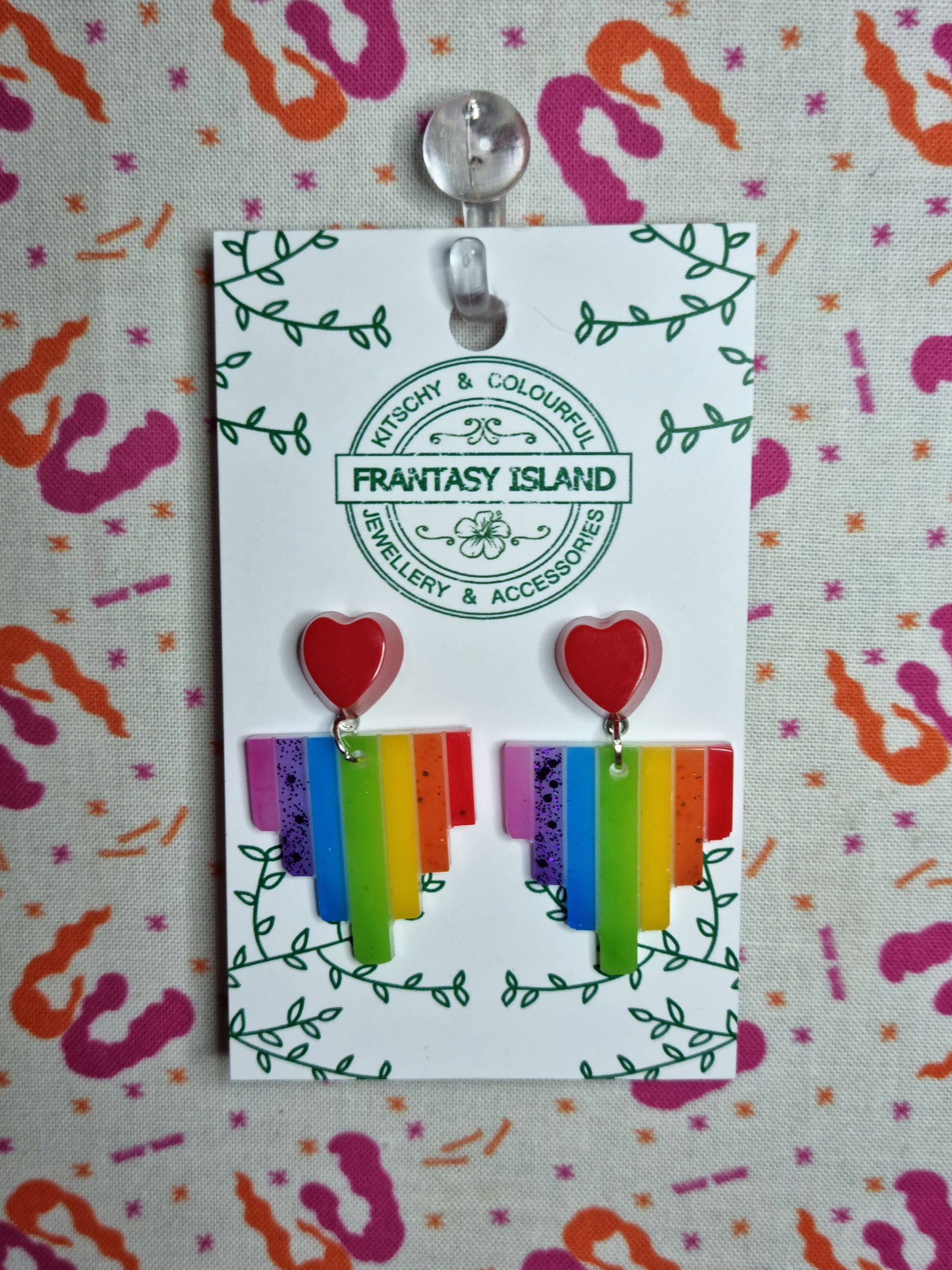 These earrings feature shimmering bright rainbow stripes hanging from bright red hearts, and will put a smile on the faces of people you meet ❤️