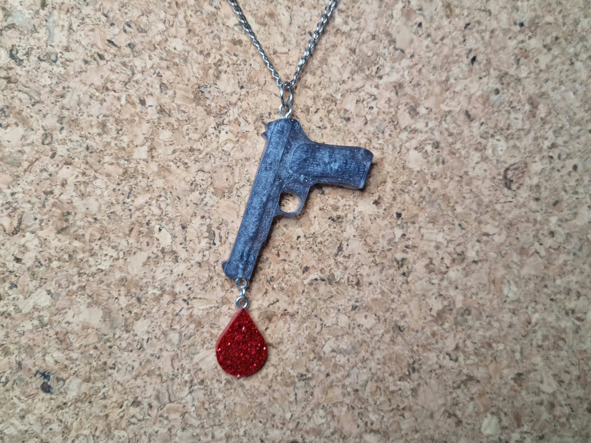 The delicate red glitter droplet hanging from the muzzle of this grey pistol necklace says all we need it to say, so I won't try and make a quippy description here. Either you'll like it or you won't, but you'll understand it.