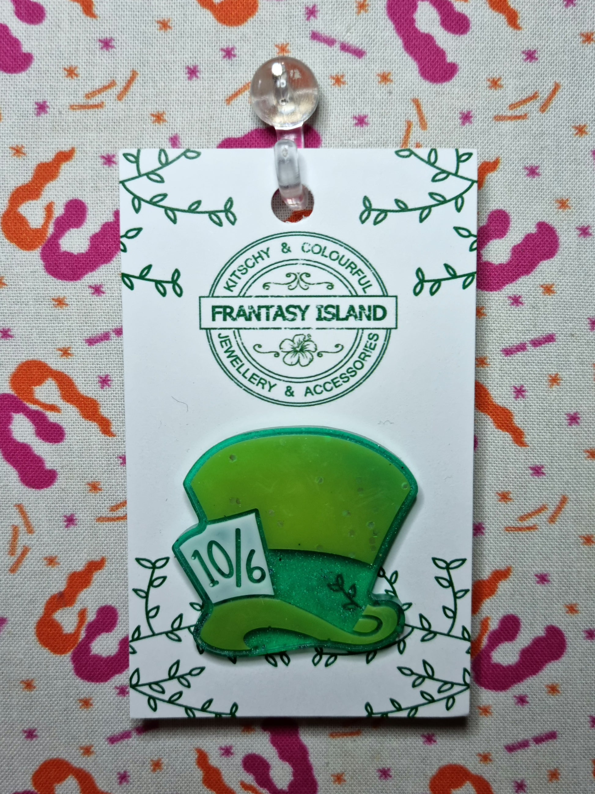 Add a little mad hatter magic to your wardrobe with this green handmade pin! Crafted from resin, this whimsical hat will bring a sprinkle of Wonderland to any outfit. Go ahead - be a little mad!